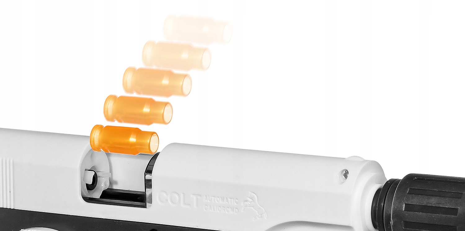 Безопасный пистолет стреляет мягкими пенными пулями, которые предварительно вставляются в пластмассовый патрон. После выстрела при следующей перезарядке снаряд выпадает сбоку, как в настоящем пистолете!