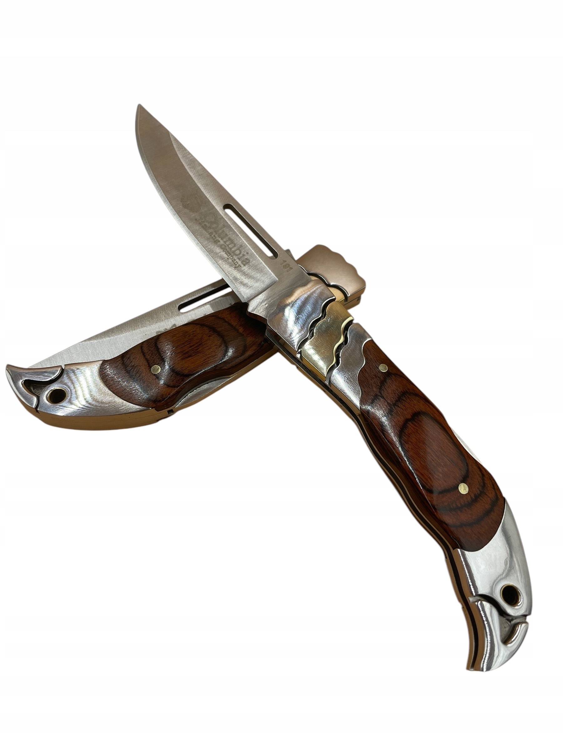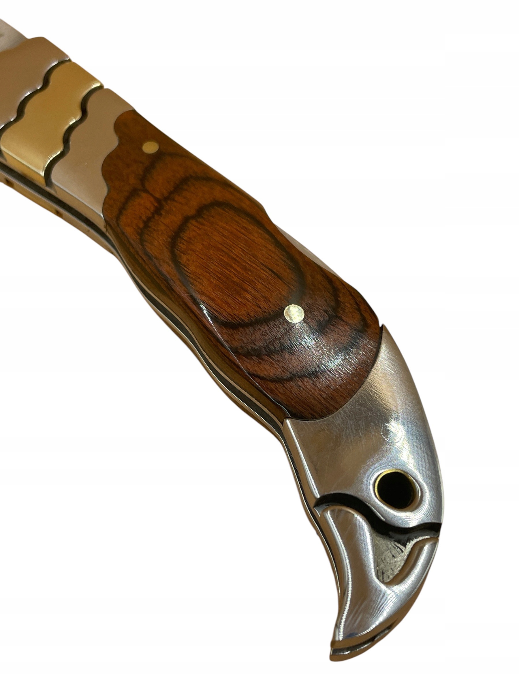 Очень твердый охотничий нож с интересным дизайном, украшенная латунными вставками, ручка в форме орлиного лука. Свернутая