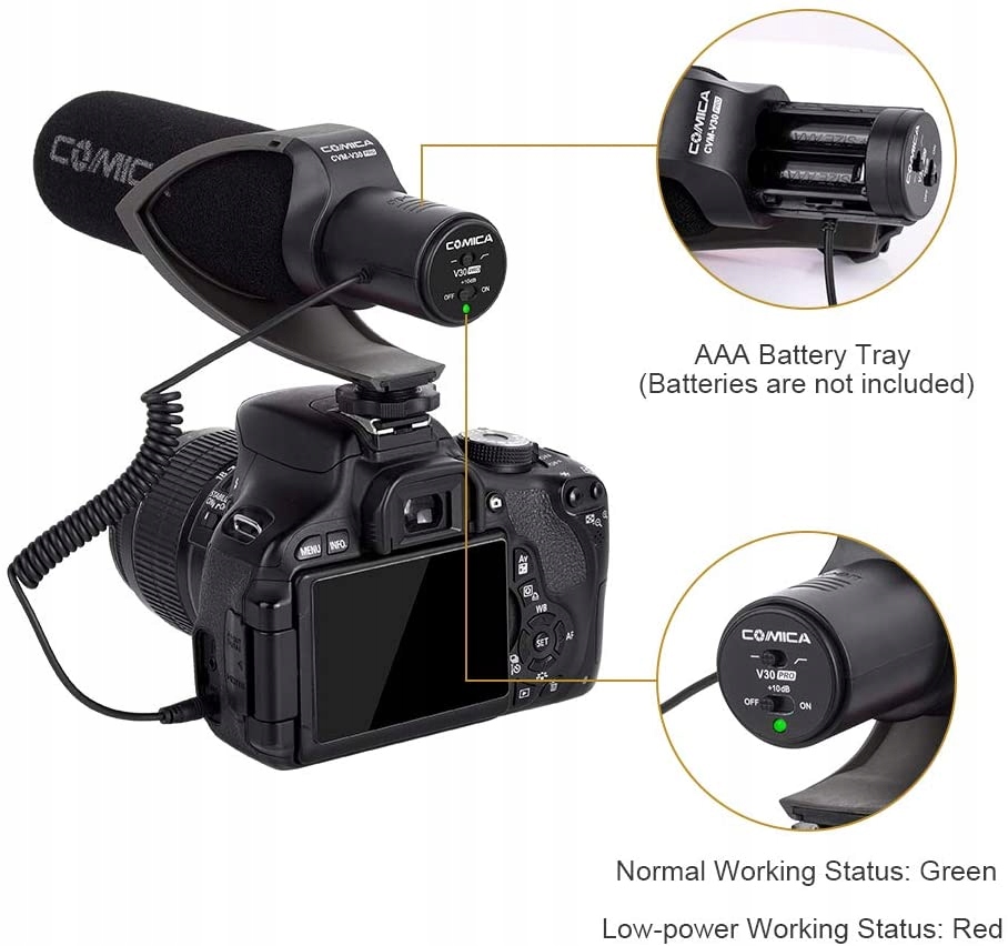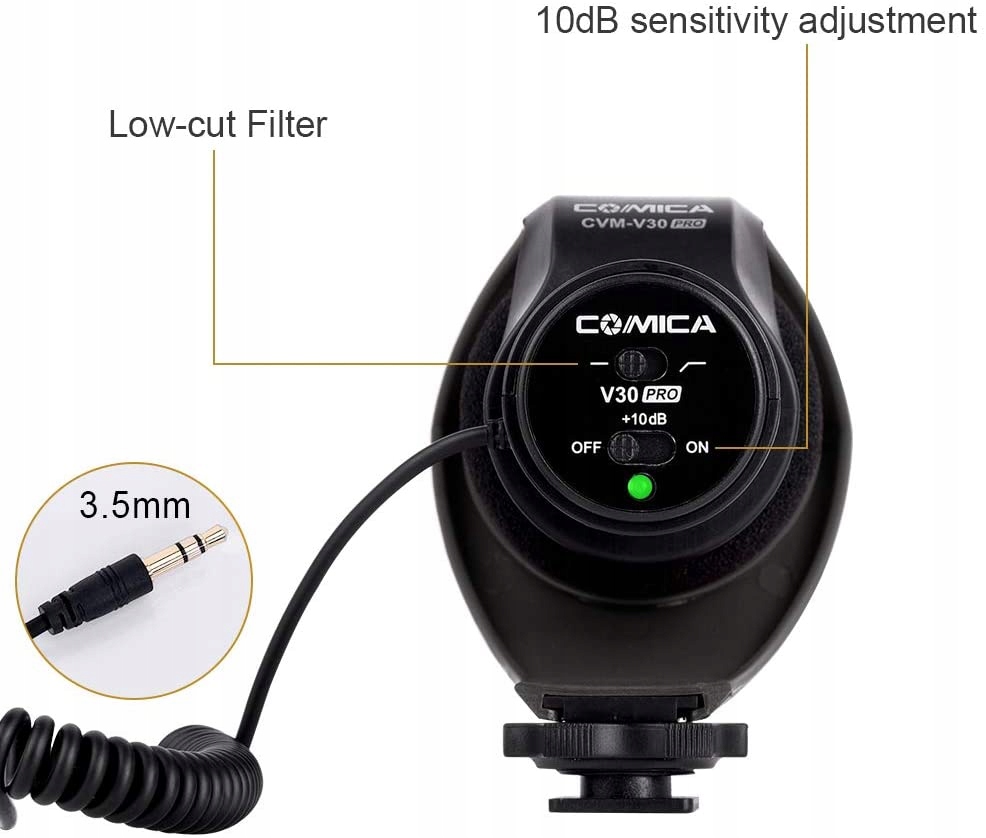 Универсальный емкостный микрофон для камеры, камеры или смартфона. Микрофон Comica - это звуковой рекордер, созданный для мобильных журналистов, Vloggers, видеомагнитофонов, нуждающихся в компактном и недорогого микрофона. Он предлагает определенно лучшее качество звука, чем встроенный рекордер. Он не требует собственного источника питания, если он загружает его с домашнего устройства. Имеет встроенный амортизатор, который эффективно подавляет вибрации и вибрации.