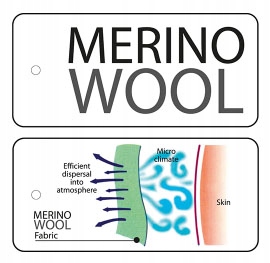 Особенности: Мериносовая шерсть обеспечивает отличную теплоизоляцию; он охлаждает кожу жарким летом и согревает морозной зимой. Это связано с тем, что в структуре шерстяного волокна задерживается много воздуха. Независимо от вида выполняемой физической активности, шерсть изолирует и регулирует температуру. Она позволяет сохранять тепло в мороз и прохладу в жару, а также одновременно отводит влагу, оставляя кожу сухой на продолжительное время.