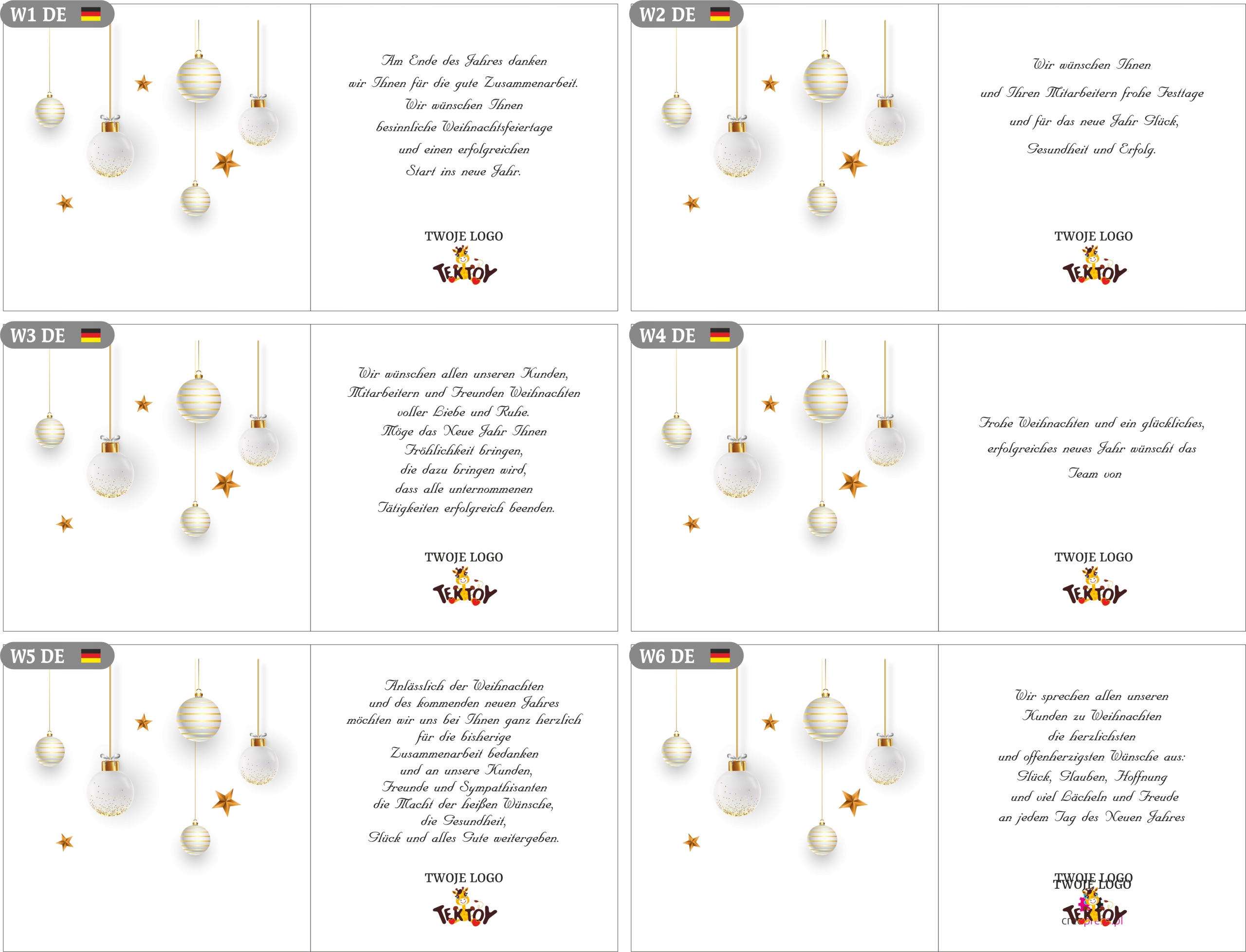 Серебряные рождественские открытки изготовлены из белой бумаги высочайшего качества с печати и серебряной/позолочкой - горячая штамповка 3D. Обложка имеет красивую графическую тему. Текст пожеланий может содержать все ваши данные, также можно распечатать логотип по желаниям (мы выполняем минимум 20 ПК при заказе логотипа). Печатные тексты могут быть произвольными, вы можете выбрать их из наших примеров текстов или отправить свой собственный текст.