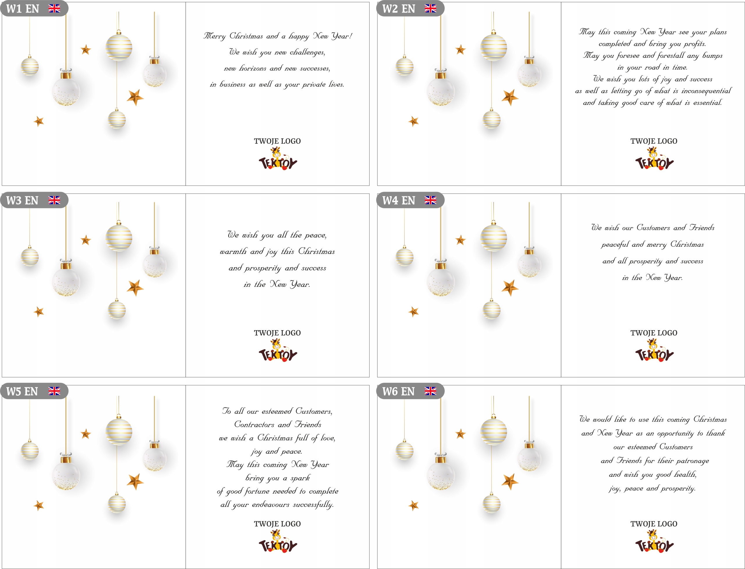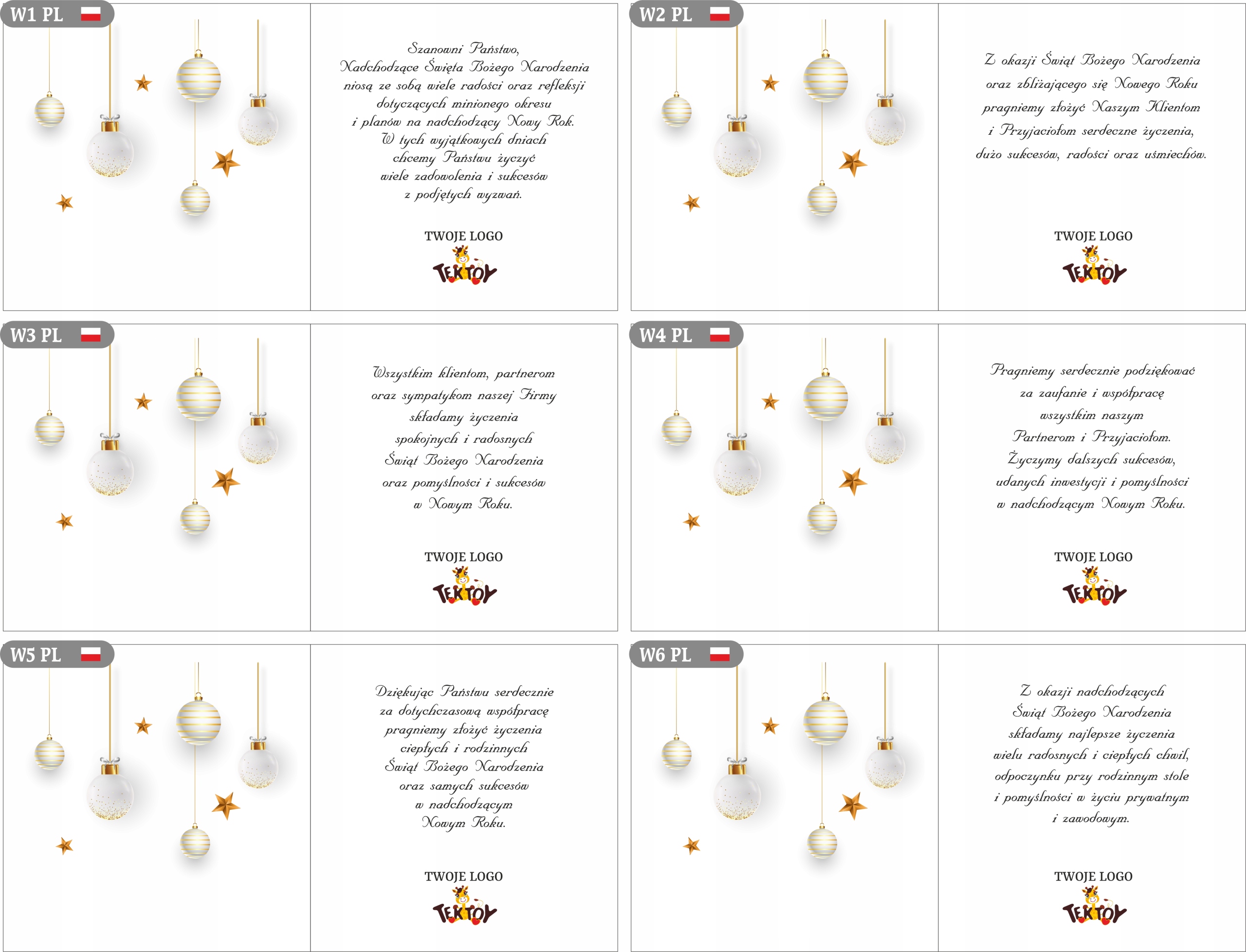 - Как часть заказа, мы производим только один тип карты (с одним текстом пожеланий и тем же логотипом). Если вы хотите заказать большее количество типов в течение одного заказа (языковые версии или другие логотипы), пожалуйста, купите правильное количество типов на нашем аукционе с названием: Дополнительные варианты для карт St. Graphic Design. - PLN 15/ПК.