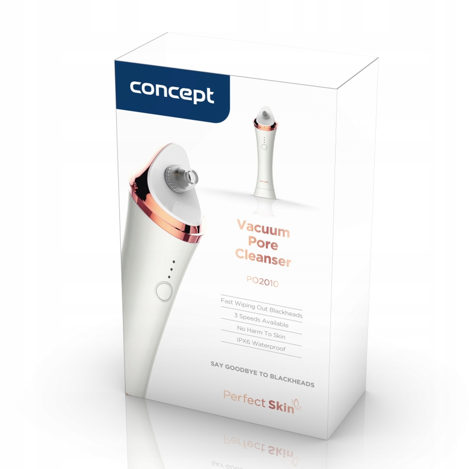 Пылесос для очистки кожи Concept PO2010 бережно очищает поры, черные точки и другие загрязнения. Имеет 3 сменные насадки и качественный литий-ионный аккумулятор с индуктивной зарядкой через USB-кабель.