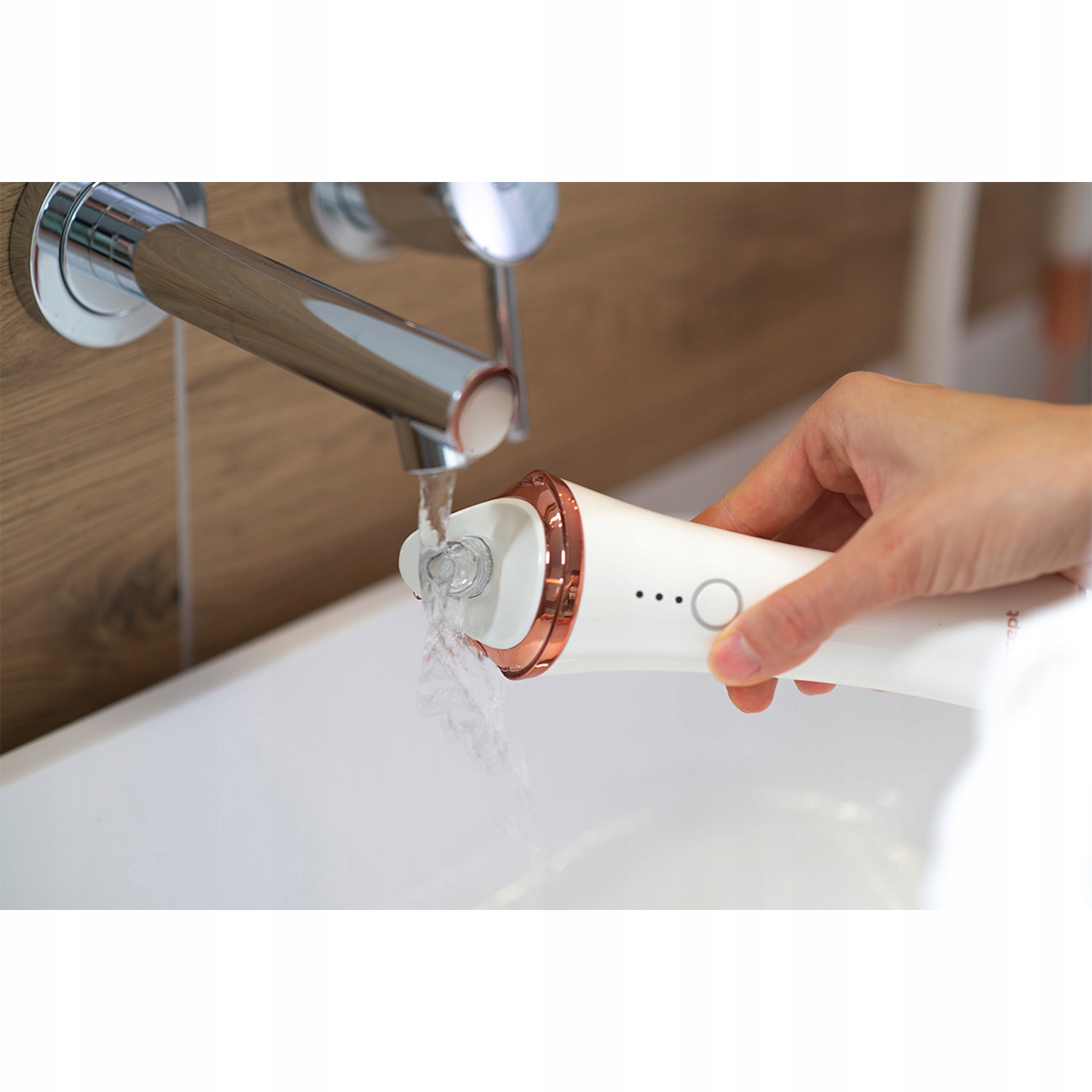 Устройство легкое и идеально лежит в руке. Он водонепроницаем, поэтому его можно мыть под проточной водой. Он оснащен высококачественным встроенным литий-ионным аккумулятором с индуктивной зарядкой через USB-кабель и функцией автоматического отключения через 3 минуты, что предотвращает случайную разрядку. Световой индикатор обеспечивает предварительный просмотр установленной в данный момент интенсивности очистки и одновременно предупреждает о необходимости подзарядки.