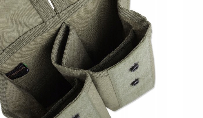 Подсумок изготовлен из полиэстера 1000D и рассчитан на четыре или два магазина АК, G36, AUG, M16, M14 и аналогичных магазинов. Карманы закрываются на липучки и дополнительные кнопки, расположенные на двух высотах, что позволяет подогнать застежку под размер и количество магазинов. Подсумок крепится к жилету четырьмя вертикальными ремнями, соответствующими стандарту MOLLE/PALS. Размеры: Высота: 200-230 мм Ширина одного кармана: 75 мм Ширина подсумка: 165 мм Цвет: зеленый ОД
