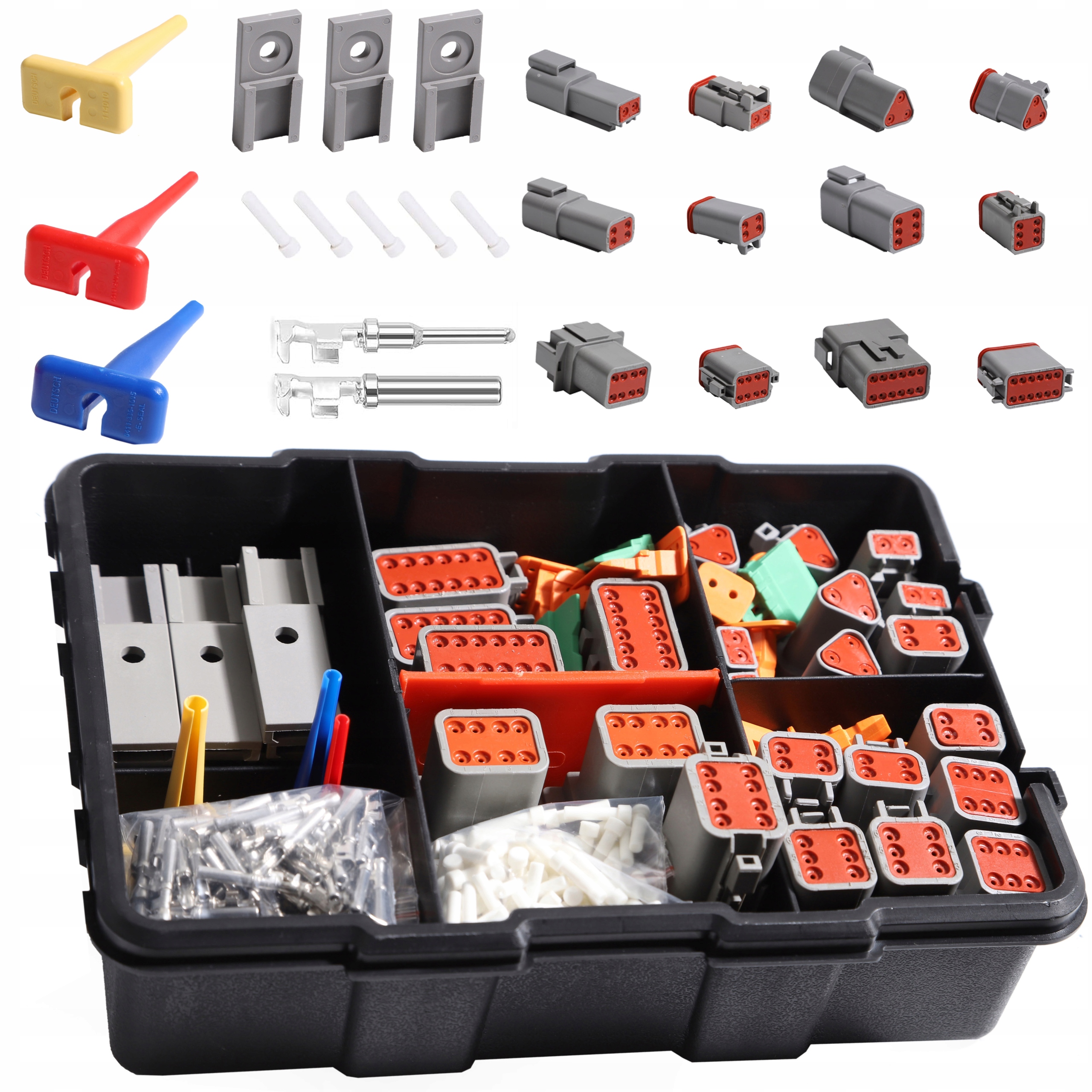 Пакет содержит: 12 комплектов 2 3 4 6 8 12-контактные Deutsch Connectors; 80 ПАРОВАЯ ПРЕДОСТАВЛЕНИЯ КОМПЛЕКТОВ Разъем DT имеет степень защиты IP68 и является коррозионным устойчивым, устойчивым к высоким и низким температурам от -40 ° C до 125 ° C