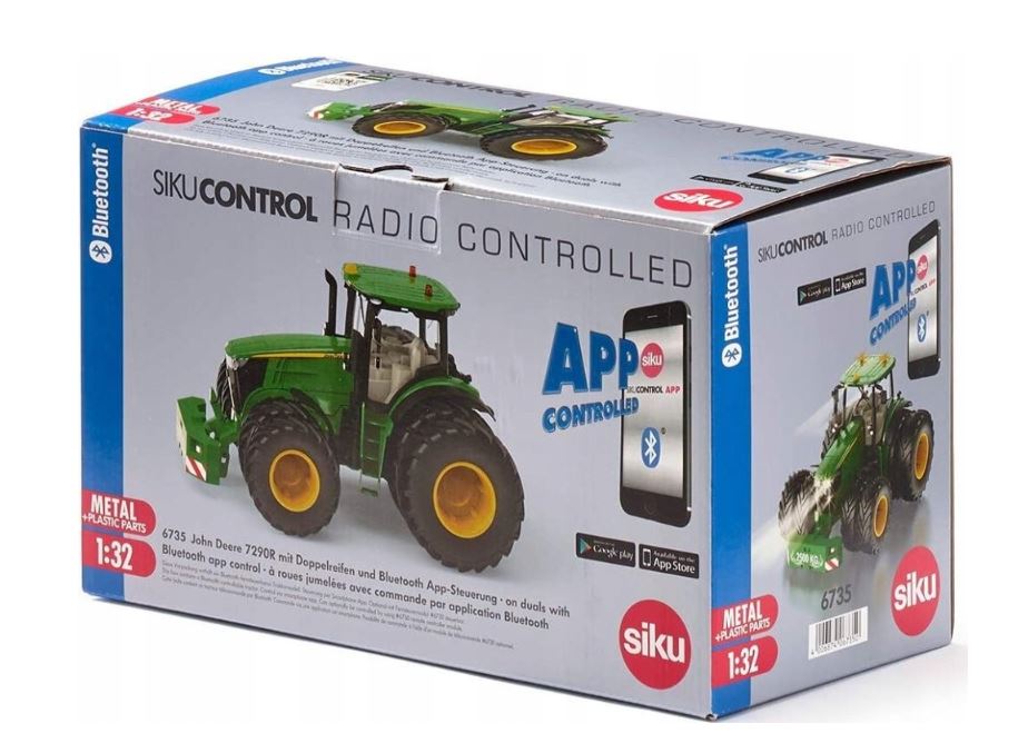 Siku Control - Bluetooth, John Deere с двойными колесами. Современные тракторы оснащены цифровыми технологиями для эффективного выращивания почвы. Новый Sikucontrol John Deere 7290R контролируется с помощью смартфона или планшета с использованием приложения Siki и технологии Bluetooth. Джон Дир из последней серии 7R с двойными шинами имеет впечатляющий вид. Если почва мягкая, двойные шины уменьшают давление на землю. Шины соединены магнитами, которые безопасно интегрированы с дисками. Шины могут быть установлены и удалены очень быстро и без использования инструментов. John Deere 7290R может ездить на нормальных шинах с двойными шинами на передней и задней оси или с двойными шинами только на задней оси. Трактор изготовлен из металла с пластиковыми частями. Все функции, а также три уровня скорости контролируются применением. Его можно контролировать с помощью виртуального jyistick или с использованием датчиков движения и наклона мобильных устройств. Точно так же, как подключение и отключение трейлеров, вы можете сделать точные маневры, используя приложение. По этой причине заднее сцепление контролируется в электронном виде. Используя приложение, вы можете включать и выключать фары на маске, на салоне, задних индикаторов и мигающих огней. Приложение Siku также предоставляет поклонникам трактора полезной информации о автомобиле John Deere 7290R. Вы также можете написать название трактора. Настройки приложения и функции обновляются на постоянной основе. Использование функции OTA (в эфире). Шкала: 1:32. Размеры: 197 x 145 x 111 мм. Размеры упаковки: 29,5 x 17,5 x 14,7 см. Возраст: 3+