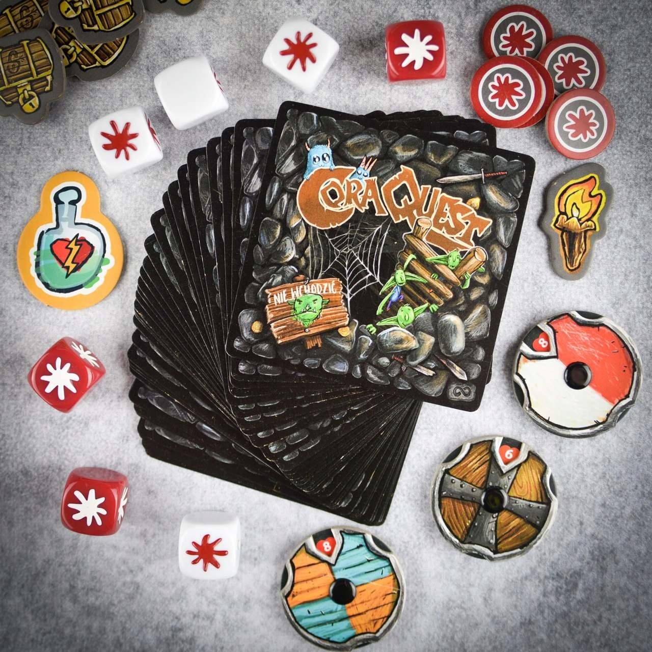 Идея игры родилась однажды днем, в однообразный период карантина. Моя восьмилетняя дочь Кора и сорокапятилетний я уже устали от школьных заданий и, чтобы разнообразить, решили создать настольную игру. Идея неожиданно набрала обороты, пока игра, зародившаяся на нашем кухонном столе, не превратилась в коробку (…). CoraQuest — кооперативная игра — это значит, что вы все будете работать вместе и вместе радоваться победе или терпеть горечь поражения. В ходе игры вы будете возглавлять четырех героев, исследуя опасные подземелья, сражаясь с монстрами и добывая сокровища. Перед каждой игрой вы будете решать, хотите ли вы играть в стандартную или более длинную версию (45-60 и 60-75 минут соответственно), каких героев вы возьмете в подземелья и, наконец, в какое приключение вы будете играть. Возможно, вы будете сражаться с огромным монстром, искать ингредиенты для волшебного зелья или преследовать воров чизкейков! Оказавшись в подземельях, вам придется исследовать их комнату за комнатой. За каждым углом могут скрываться гнусные орки, опасные ловушки или событие, которое будет способствовать развитию сюжета вашего приключения. Будь осторожен! Если враги победят хотя бы одного героя, вы все проиграете. После нескольких игр вы, возможно, захотите создать свои собственные приключения, героев и врагов, используя наше приложение и руководство по модам. Мы искренне надеемся, что эта игра доставит вам как минимум такое же удовольствие, как и нам во время ее создания.