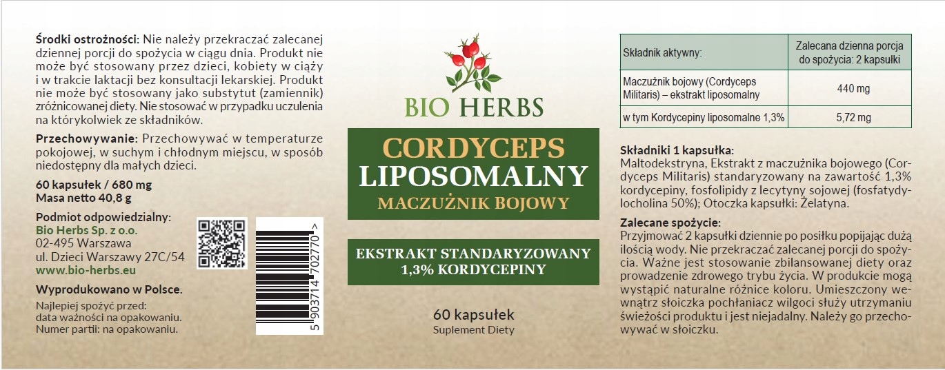 liposomal cordyceps - это передовая формула, которая сочетает в себе экстракт Cordyceps Militaris, гриб, оцененный в традиционной восточной медицине, с инновационными липосомальными технологиями. Каждая из 60 капсул содержит стандартизированный экстракт на 1,3% kordycepin - биологически активное соединение, которое поддерживает естественные процессы в организме, укрепляя его сопротивление, силу и жизнеспособность. Благодаря липосомной технологии активные ингредиенты более эффективно поглощаются организмом, что приводит к их большей эффективности. Cordyceps поддерживает энергетический уровень , улучшая физическую производительность и общее состояние тела . b>, защита организма от инфекций. Это предназначено для? Особенно рекомендуется для спортсменов, людей, ведущих активный образ жизни, и тех, кто хочет улучшить респираторные функции и общее состояние тела. >
