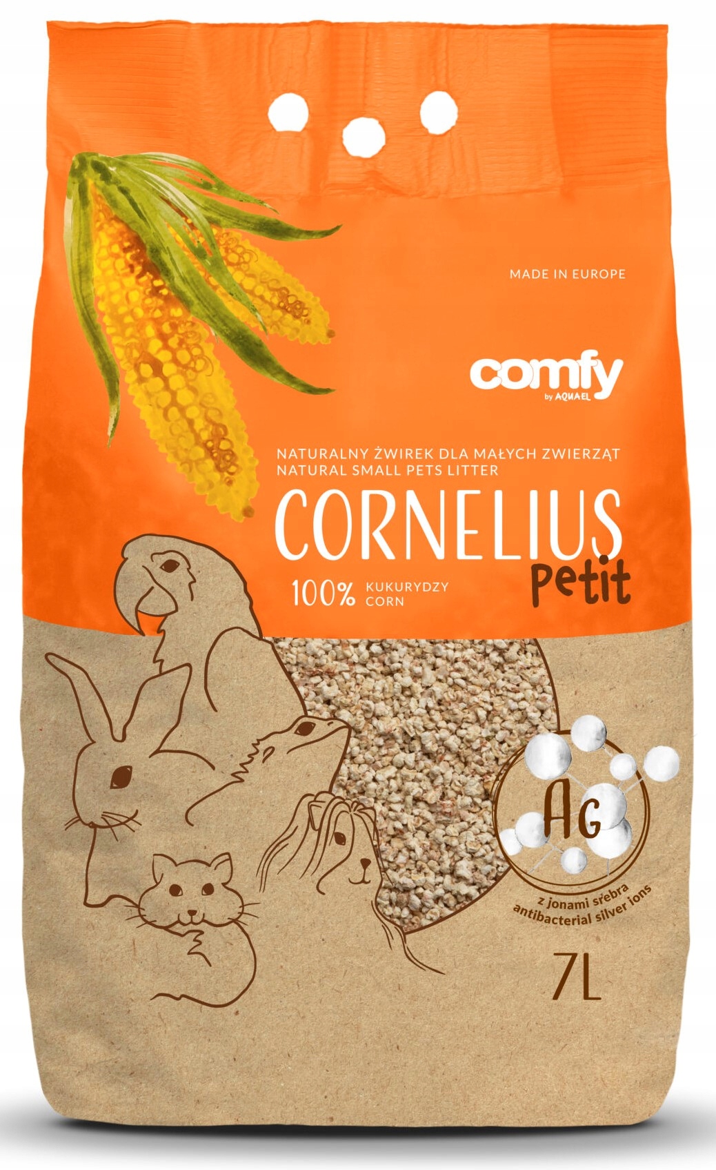 CORNELIUS PETIT SILVER – универсальный субстрат, изготовленный из 100% кукурузы. Он обогащен ионами серебра, которые препятствуют развитию бактерий и грибков (в том числе плесени), что положительно влияет на здоровье животных. Идеально подходит для наполнения клеток и вольеров для мелких млекопитающих и птиц, а также террариумов с некоторыми рептилиями. Полностью натуральный и полностью биоразлагаемый, компостируемый. Он не образует пыли, не вызывает аллергии, бережен к чувствительным лапам животных. Он эффективно впитывает влагу, нейтрализует и связывает неприятные запахи. Он эффективен и длится долго. Выпускается в прочных, удобных 7-литровых мешках. Сделано в Европе.