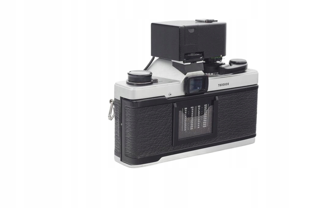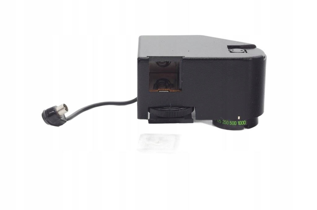 Чтобы установить адаптер, сначала установите диск выдержки на камере на тысячные доли, что является максимальным значением для этой камеры. Поднятие рычага в верхней части адаптера AEC перемещает диск выдержки вверх, позволяя ему надеть башмак камеры. Опущенный рычаг затем фиксируется в ранее упомянутом штифте на диске камеры, помещая другой диск поверх диска на камере. Затем кабель адаптера AEC подключается к разъему на передней панели камеры, как показано выше. AEC означает автоматический контроль экспозиции. Мы предполагаем, что адаптер подключается к экспонометру камеры и соответствующим образом поворачивает шкалу.