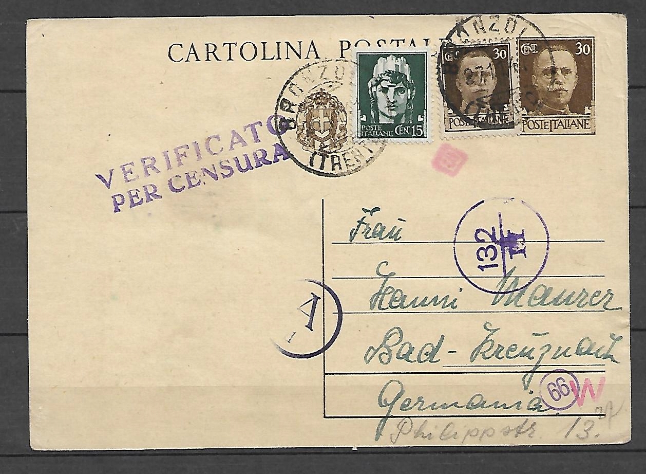 СП. ОТПРАВЛЕНО ИЗ ИТАЛИИ В ГЕРМАНИЮ, ЦЕНЗУРА 1941 ГОДА