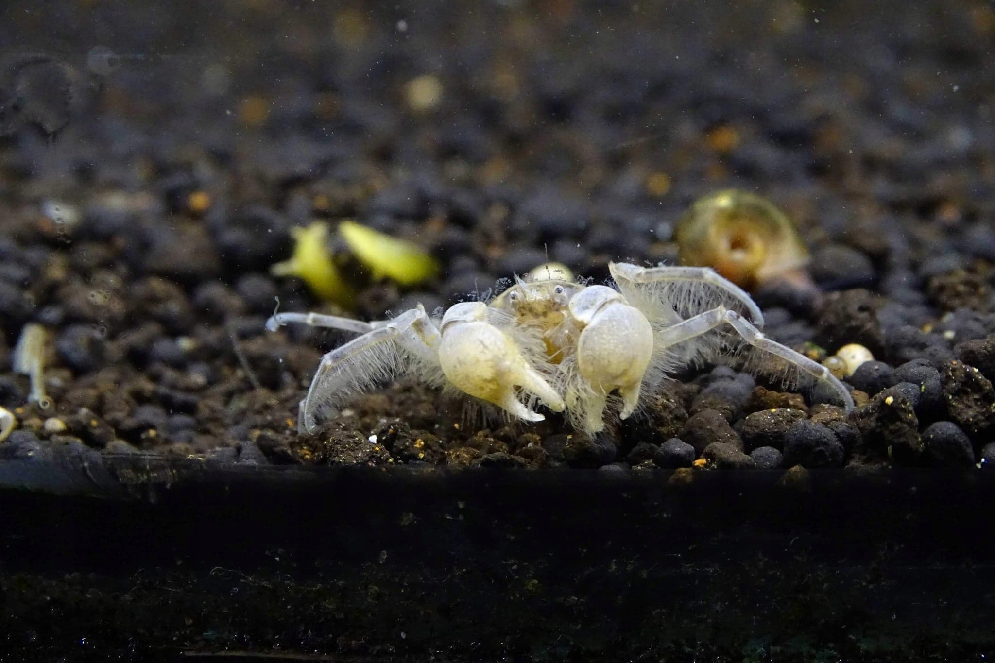 Торговое название: Микрокраб Научное название: limnopilos naiyanetri Происхождение: Таиланд Размер: до 1 см Температура воды: 22 - 26 ° C Параметры воды: жесткая вода. Сладкий. Поведение: неагрессивное Степень сложности: среднее расстояние. У него длинные ноги, покрытые микро -волосами. Мы можем найти его в различных цветовых сортах крем, темно -коричневого и серого.