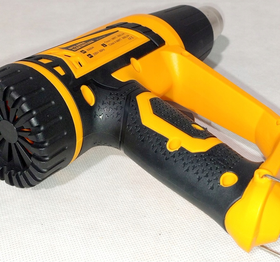 - Особенно легкий инструмент для: сушки, оттаивания, удаления старого лака, применения фронтальных виниров, сокращающихся сугровости, удаления краски, удаления наклеек и различных покрытий и т. Д. Двигатель расположен под прямым углом относительно потока горячего воздуха, защищен таким образом от загрязнения