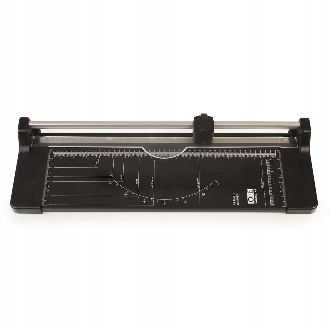 Данные о форматах и размерах, применяемых на металлической основе, значительно помогут вам работать с устройством и позволит вам разрезать бумагу в соответствии с вашими потребностями. На стойке резака вы найдете миллиметровый и дюймовый шкал, угол, а также маркировку самых популярных форматов, таких как: A3, A4, A5 или фото форматы: 13 x 18, 10 x 15 или 9 x 13 см.