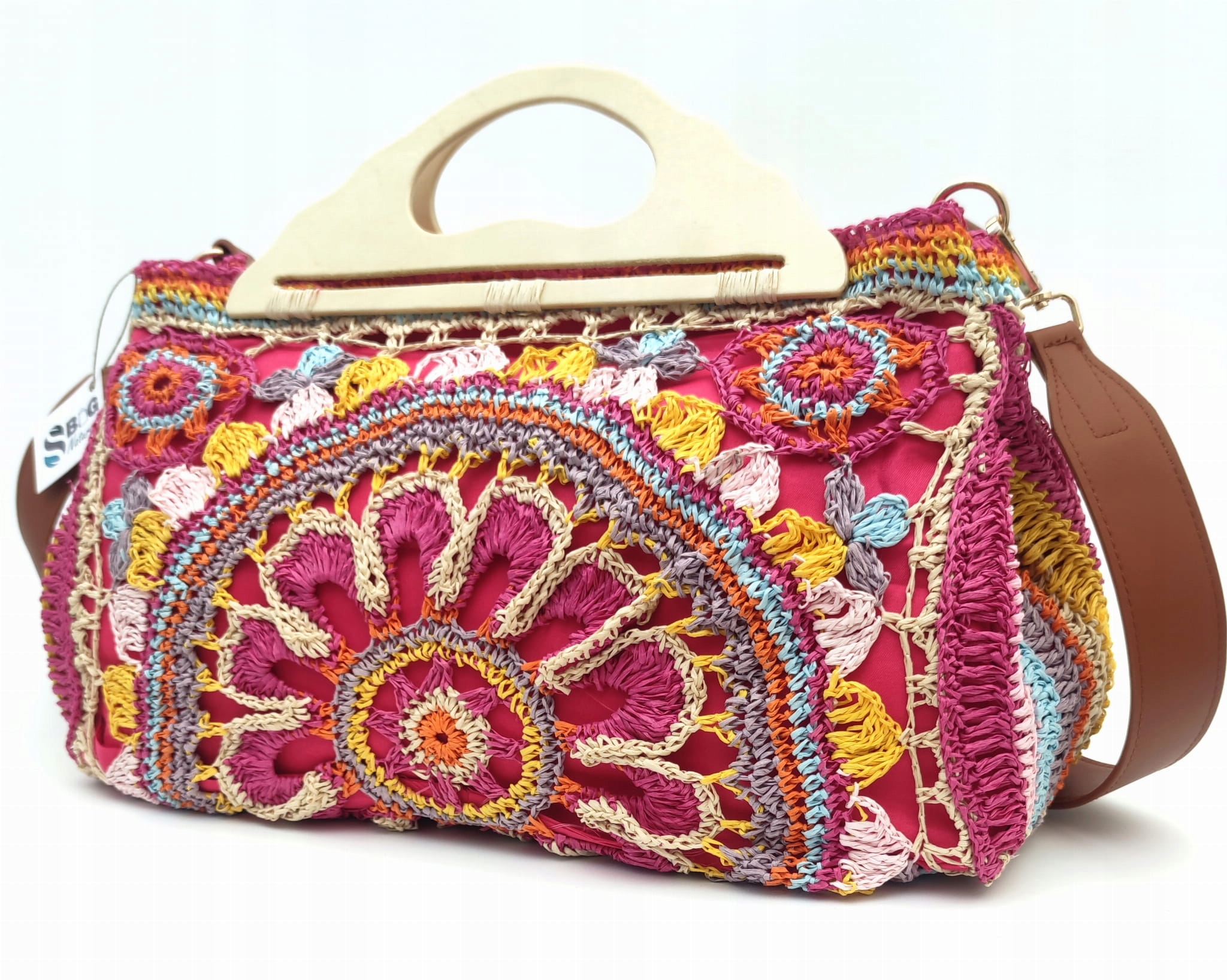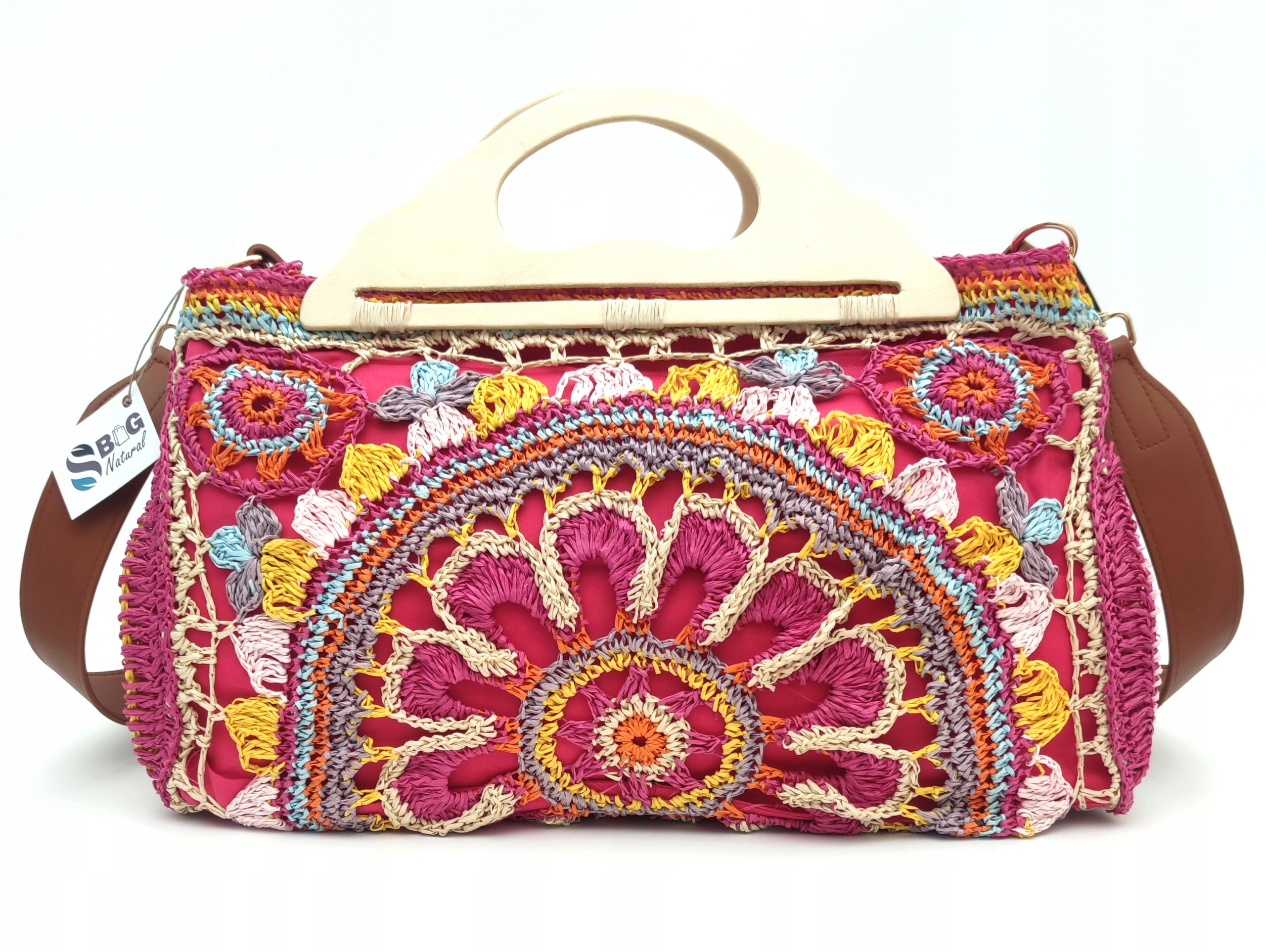 - Сумка ручной работы из яркой рафии с красивыми узорами, связанными крючком.