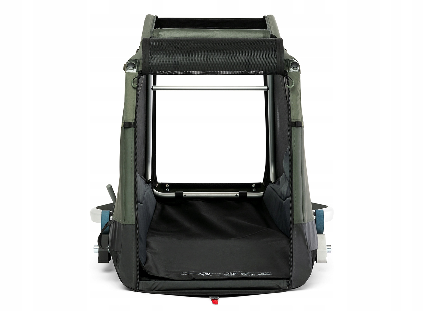 Прицеп оснащен прочной панелью пола и противоскользящим ковриком. Корпус покрыт материалом, обеспечивающим оптимальную вентиляцию благодаря наличию воздушных москитных панелей. Дополнительные отверстия и чехлы, а также их защита обеспечат комфорт как любопытным питомцам, так и более замкнутым.