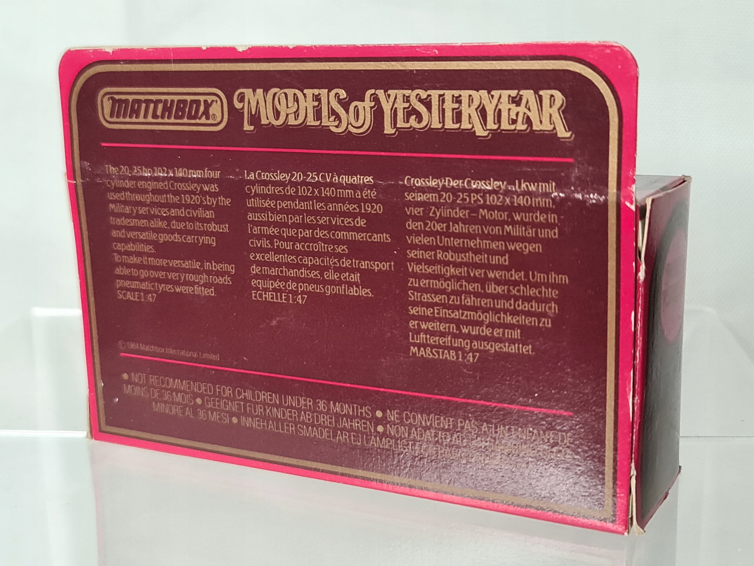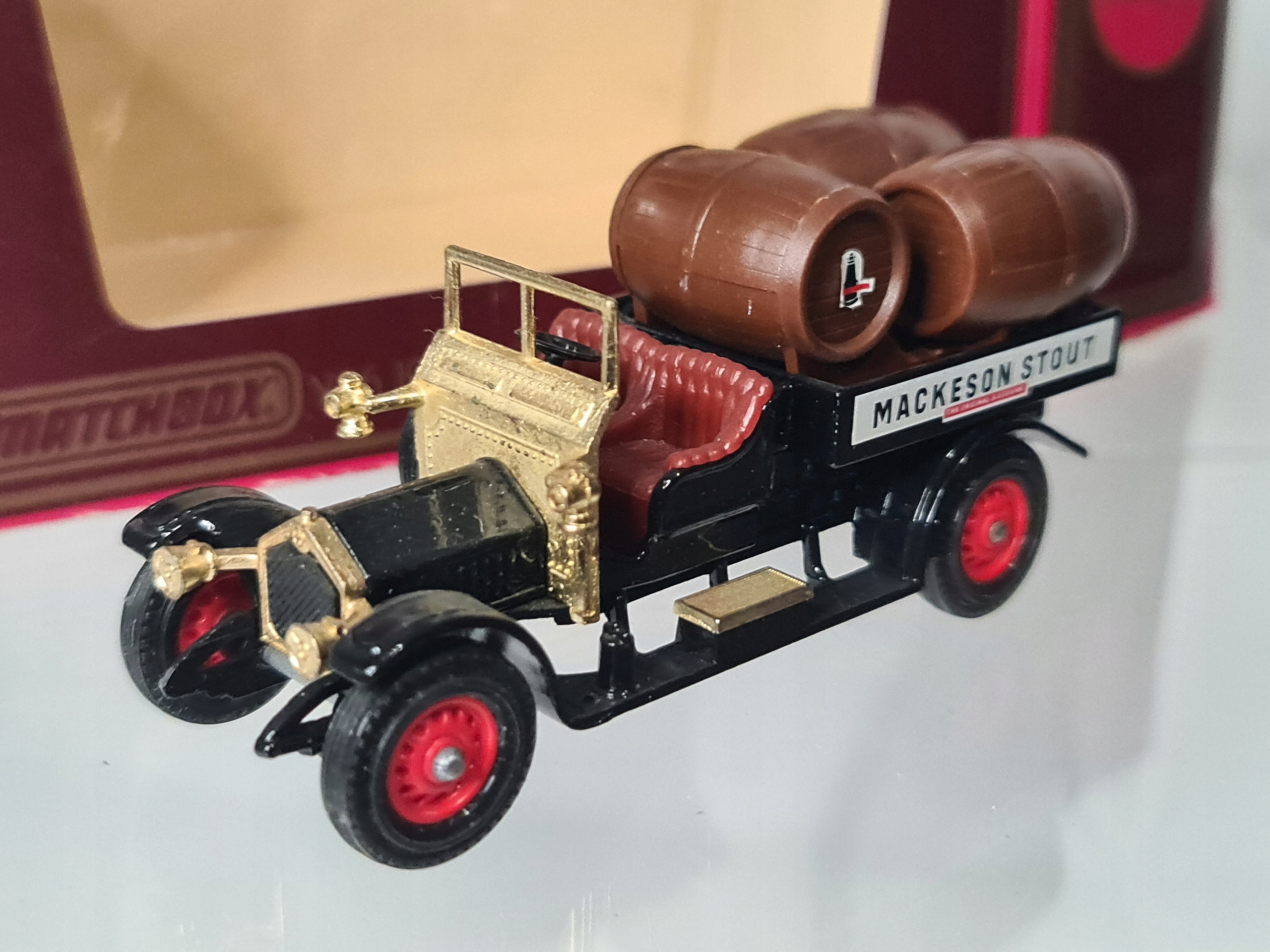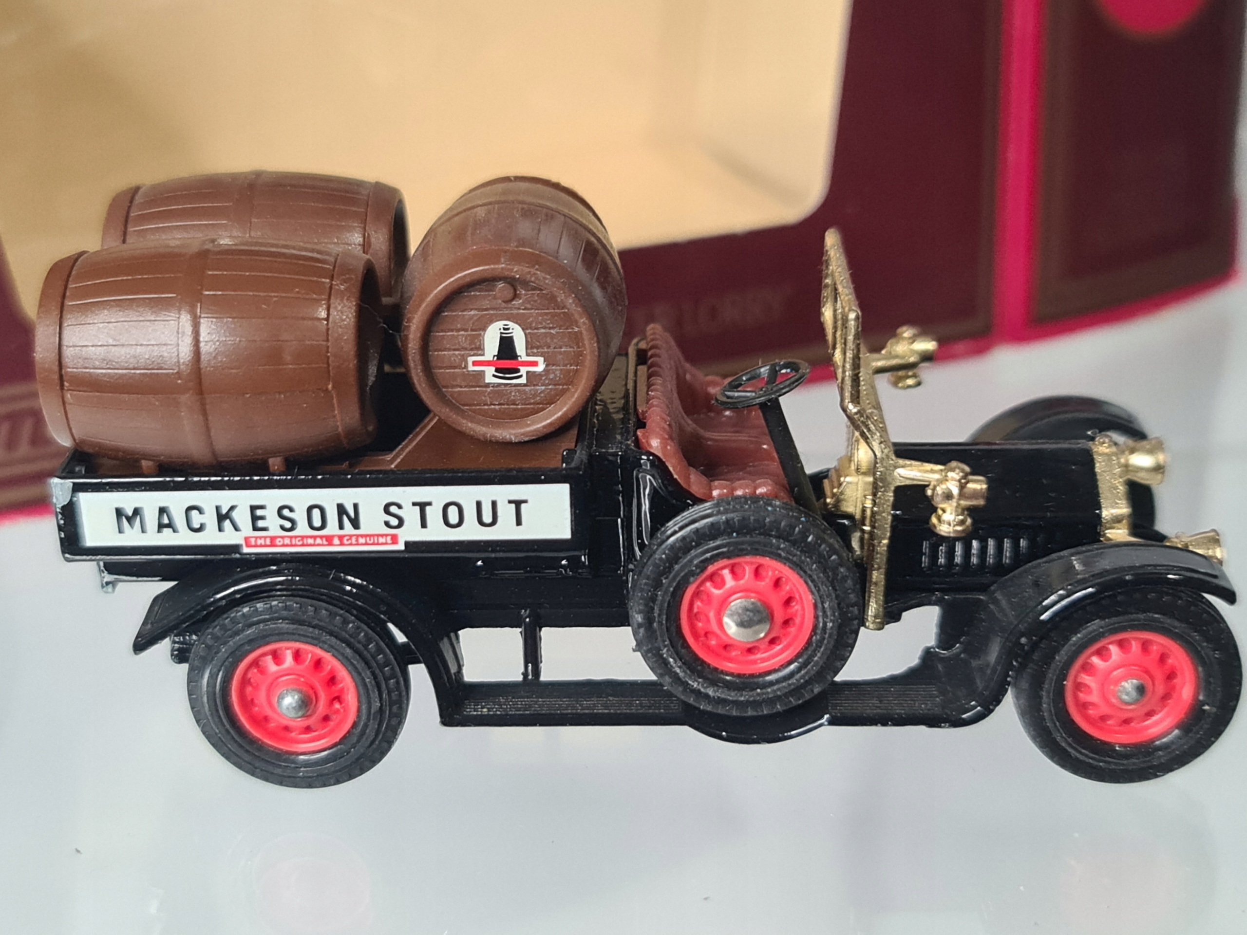 Из коллекции «Модели прошлых лет» компании Matchbox, пивной грузовик Crossley 1918 года в цветах Mackeson Stout прославляет винтажный пивоваренный транспорт с детальным мастерством и очарованием старины. На фотографиях изображена реальная модель, выставленная на продажу.