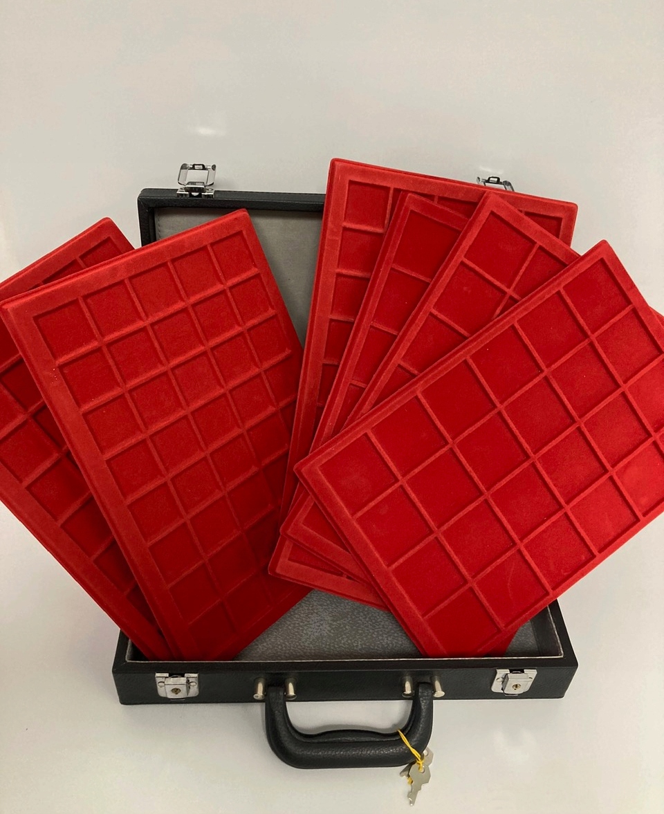 Коробка содержит 3 подноса с пространством для 24 монет и 3 подноса с пространством для 40 монет. Размеры отверстий: это 45x45 мм и 35x35 мм соответственно