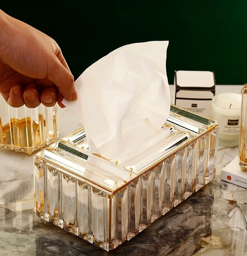 Коробка с салфетками с кристаллами по бокам и сверху. Дно контейнера металлическое, дополненное четырьмя круглыми подставками для ног. Отверстие прямоугольное.