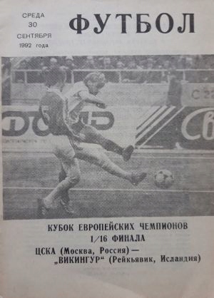 Описание: Официальная программа, выпущенная к матчу Кубка Чемпионов ЦСКА Москва - Викингур Рейкьявик (4:2, голы: Сергеев, Корсаков, Гришин, Колесников - Эйнарссон, Стейнссон), который состоялся 30 сентября 1992 года. В программе, среди прочего: интервью с тренером - Геннадием Костылевым, история выступлений ЦСКА в еврокубках, история "Викингура Рейкьявика". Программа написана на русском языке.