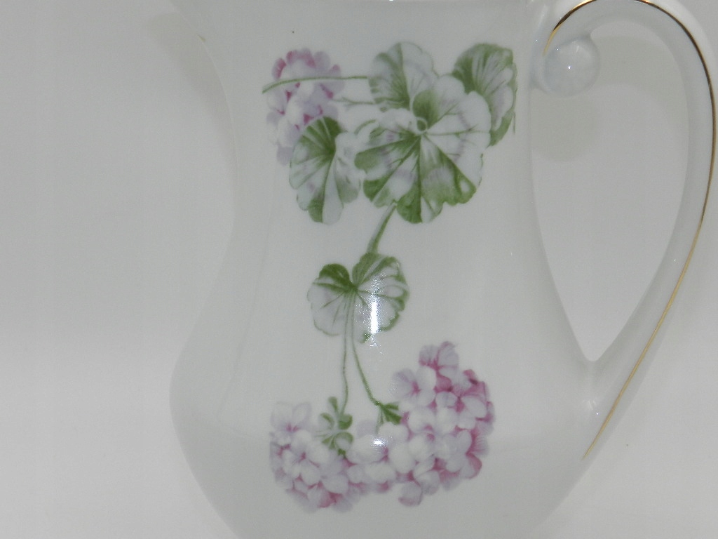 Белый фарфор чрезвычайно гармоничной формы с чудесным мотивом фиолетовой герани. Все отделано тонкой золотой позолотой.