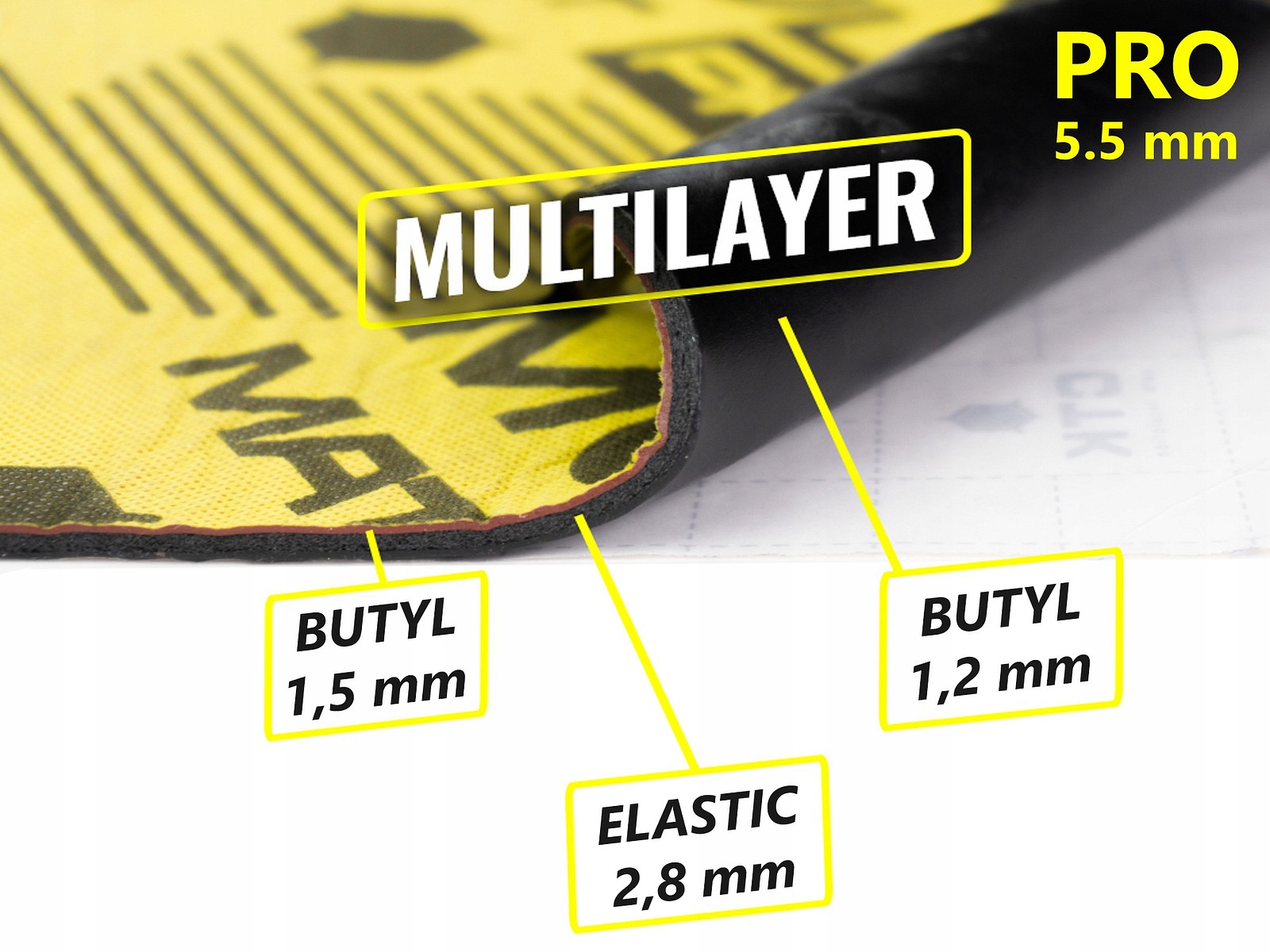Multimat PRO – качественная многослойная звукоизоляция материал, сочетающий в себе демпфирующие, звукопоглощающие и изоляционные свойства. Состоит из слоя инновационной акустической мембраны на основе утолщенного бутила (1,5 мм), звукопоглощающего слоя звуко- и теплоизоляции из вспененного эластичного каучука (2,8 мм) и самоклеящегося бутил-полимерного слоя, демпфирующего и поглощает вибрации подложки (1,2 мм). ). Материал обеспечивает высокий уровень тепло- и звукоизоляции (до 32 дБ в месте нанесения), очень легко укладывается на ровные поверхности и хорошо адаптируется к форме неровных поверхностей с легким тиснением. Многослойные коврики Multimat PRO водонепроницаемы, а также могут использоваться в местах скопления влаги. Особенно хорошо они работают в качестве основного материала для шумоизоляции внутренней части дверных отсеков и крыши или в качестве второго слоя приклеиваемого к алюминиево-бутиловым демпфирующим матам в других местах кузова (пол, багажник и др.).