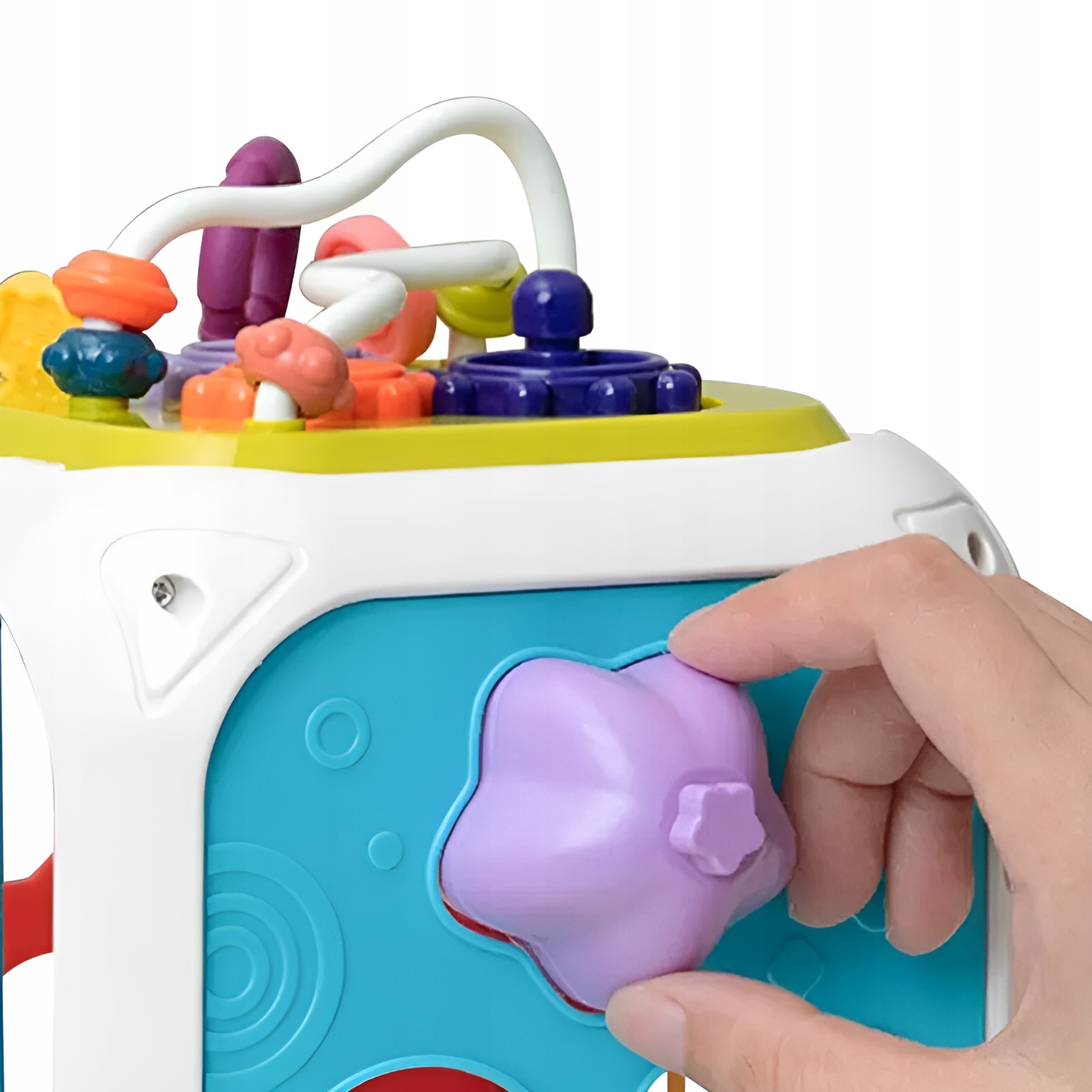 Игрушка не только развлекает, но и обучает. Ребенок может попрактиковаться в распознавании форм и цветов, помещая кубики в соответствующие отверстия сортировочного куба. Это отличный способ развить мануальные навыки и координацию движений. Кроме того, на съемной стенке куба размещены дополнительные аттракционы, такие как тарелки, шестеренки и чересстрочные элементы, что добавляет элемент интерактивной игры.
