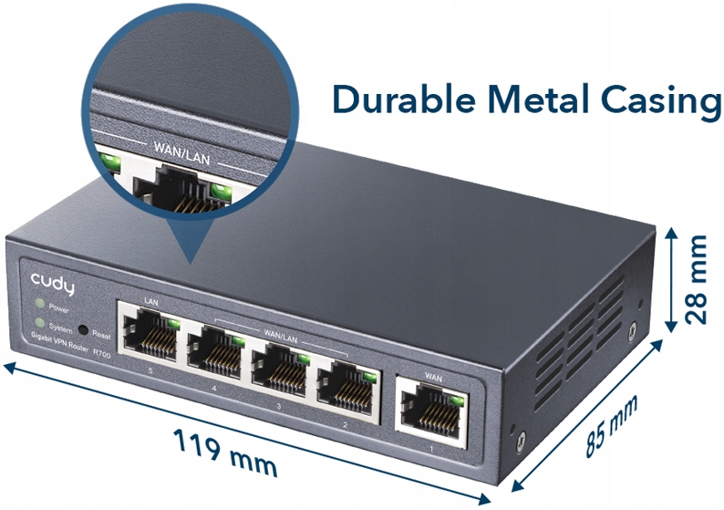 Роутер Cudy R700 имеет несколько портов WAN. Это позволяет использовать несколько интернет-источников одновременно. Порты гигабитные, что обеспечивает молниеносную загрузку сайтов, комфортный просмотр видео в Интернете или прослушивание музыки через стриминговые сервисы. Файлы будут загружены в мгновение ока. Поэтому это идеальное устройство не только для домашнего использования, но и для компаний среднего размера. Маршрутизатор Multi-WAN — отличный инструмент для технологии VPN. Устройство может использовать балансировку нагрузки. Интерфейс имеет 1 порт WAN, 1 порт LAN и 3 порта WAN/LAN.