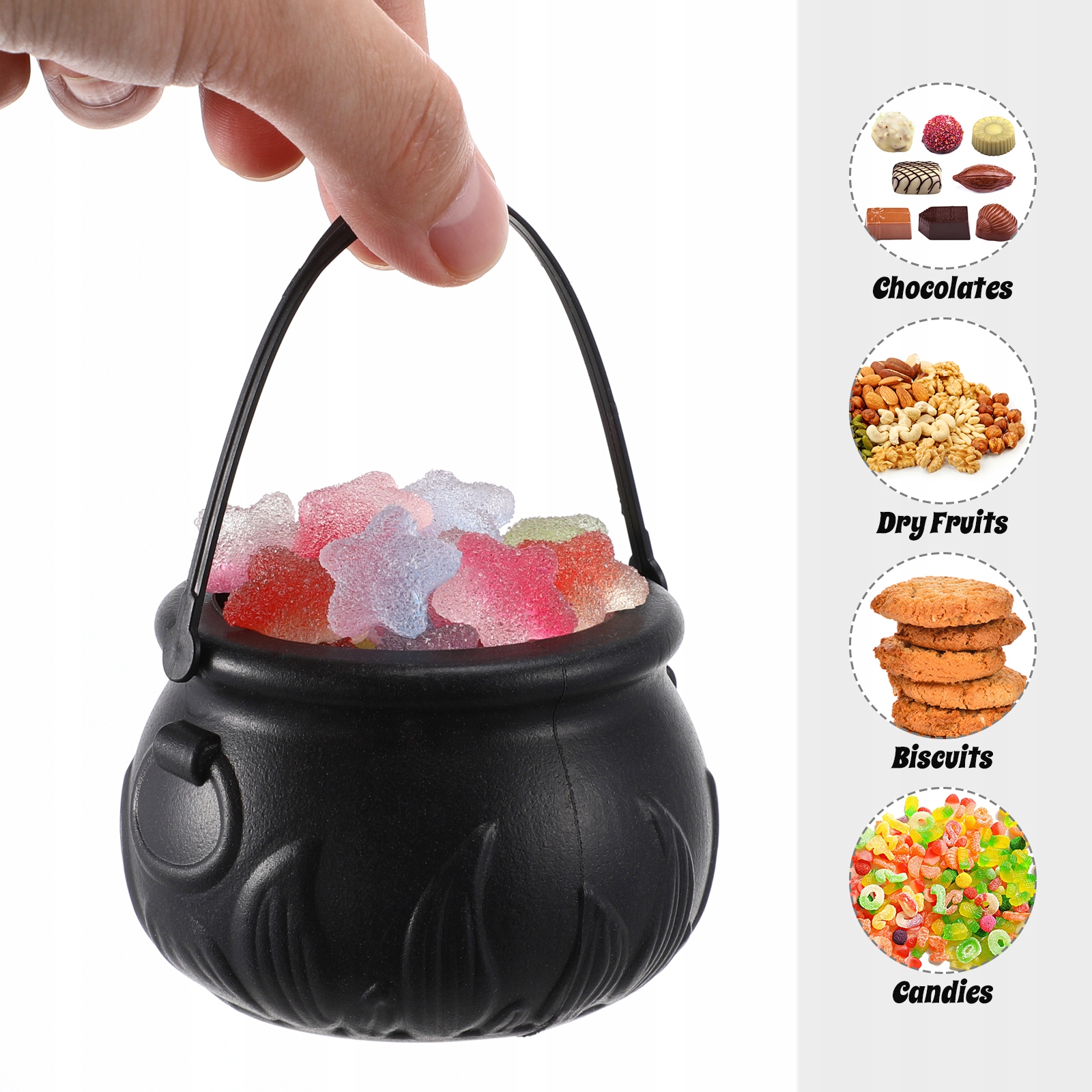 Этот предмет представляет собой банку для конфет, которая была разработана и изготовлена специально для Хэллоуина. На Хэллоуин дети могут взять эту бутылку с конфетами, чтобы хранить много конфет. Это также черный ведьмин горшок, который можно использовать, чтобы лучше выполнить свою роль. Это хороший реквизит на Хэллоуин для вас и вашей вечеринки.
