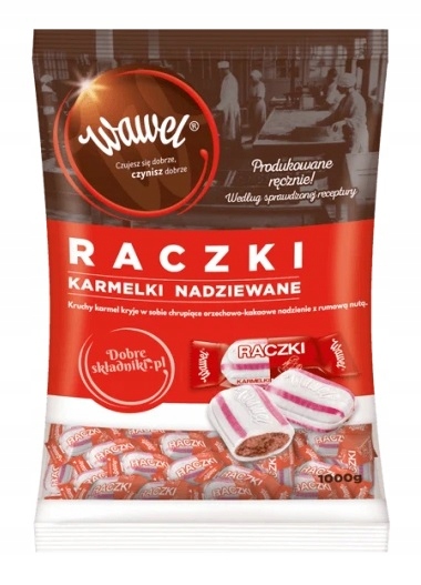Карамель с начинкой Raczki z Wawelu уже много лет производится по традиционному и проверенному рецепту с использованием ручных методов производства. Каждая конфета по-своему уникальна, хотя все они восхитительны на вкус. Их непревзойденный вкус обусловлен простым составом, полным полезных ингредиентов – без добавления консервантов, красителей и искусственных ароматизаторов. Продукт содержит лецитин из сертифицированных соевых бобов (без ГМО).