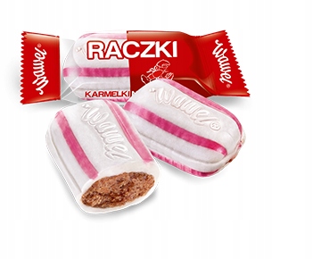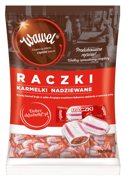 Карамель с начинкой Raczki z Wawelu уже много лет радует вкусы миллионов поляков. Конфеты уникальной формы, украшенные традиционными яркими полосками, представляют собой идеальное сочетание вкусной орехово-какао-начинки и сладкой хрустящей карамели. Характерная хрустящая начинка с нотками рома не дает пройти мимо равнодушно.