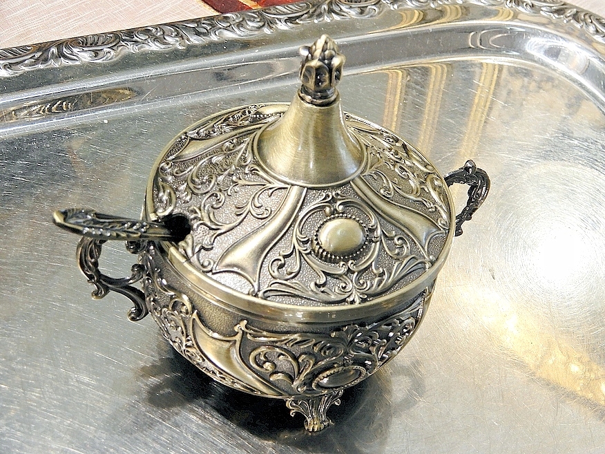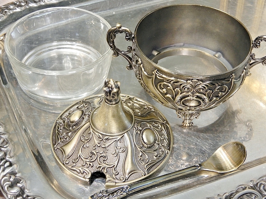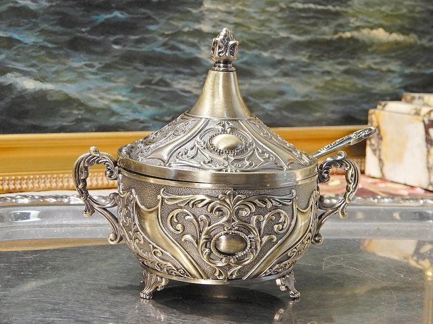 Приглашаю Вас купить красивую сахарницу. Очень интересный стиль. Все это чудесно украшено узором эпохи Возрождения или, может быть, барокко с золотыми пуговицами на крышке и по бокам сахарницы.Поднос и ложка сахарницы изготовлены из цинкового сплава, литья с латунным покрытием.Это может быть отличной идеей. для оригинального, недорогого подарка близкому человеку, бабушке или маме.