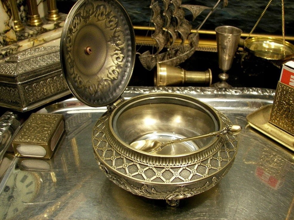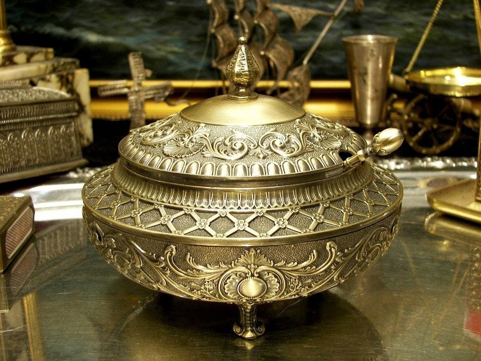 Сахарница фантастически декорирована, богатство разнообразных, пространственных узоров делает изделие кажется, что его взяли из сказки «Тысяча и одна ночь».