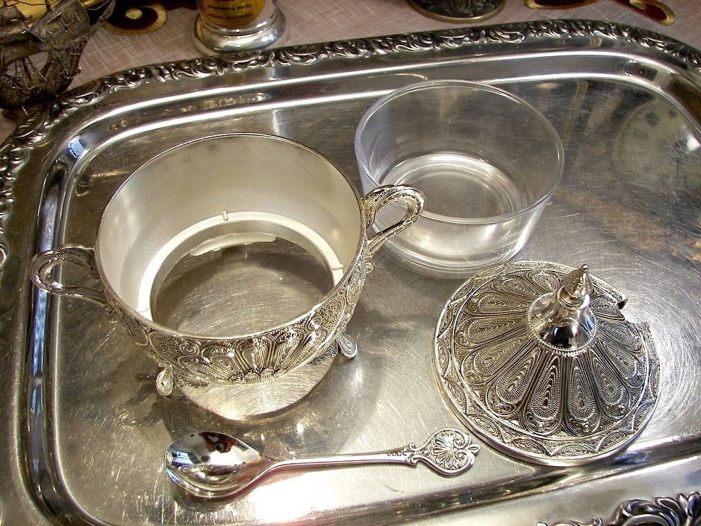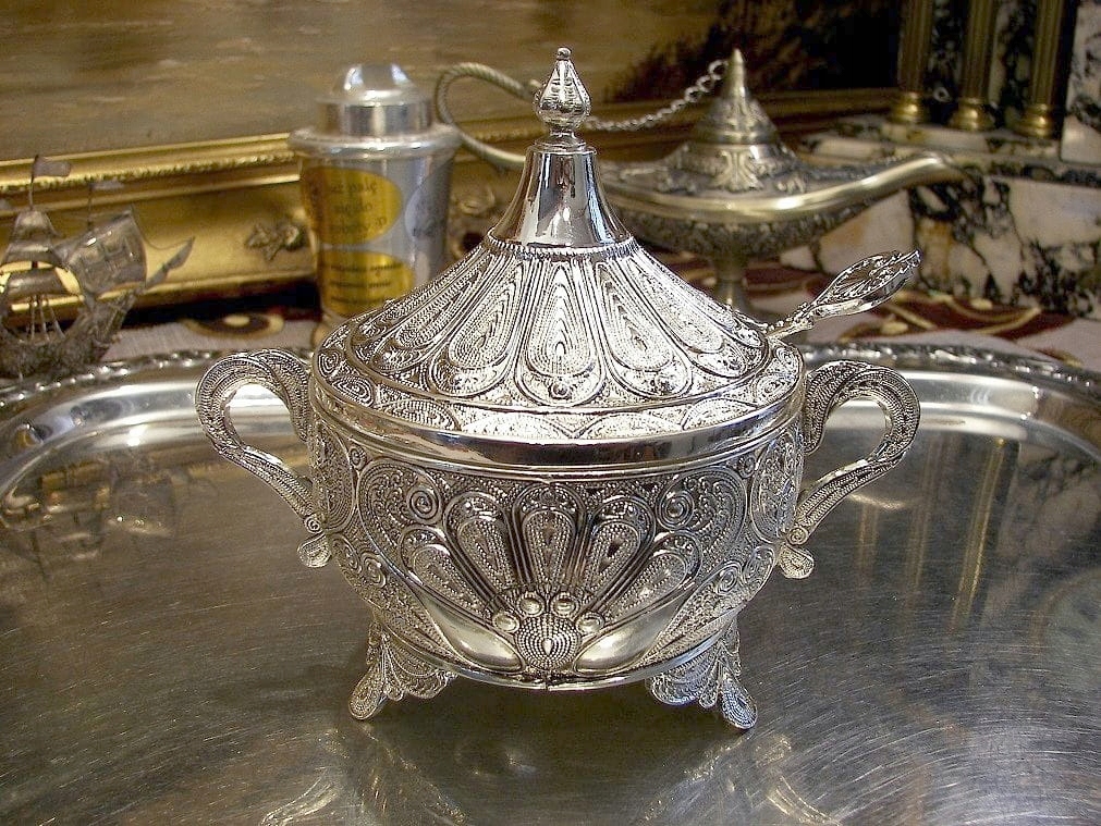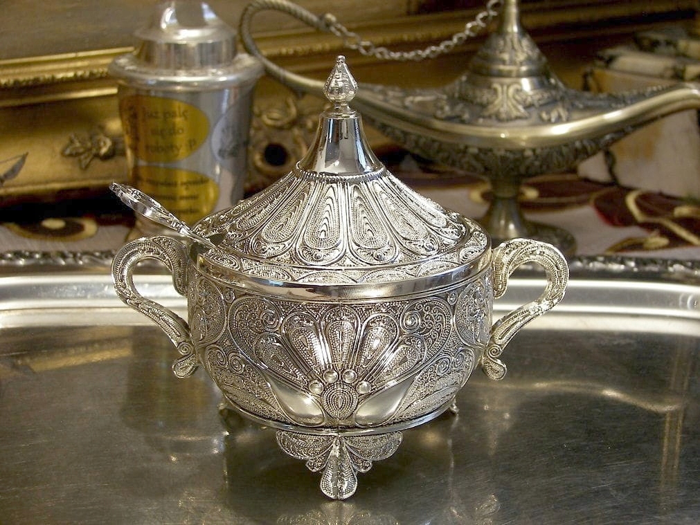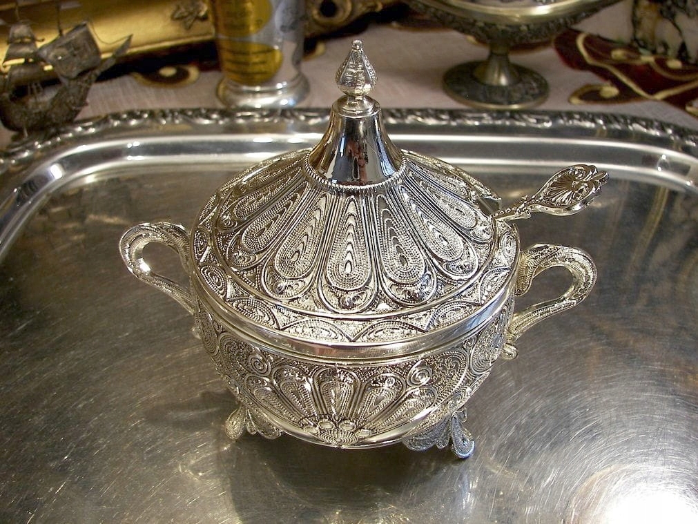 Приглашаю Вас купить красивую серебряную сахарницу.Узор на сахарнице под названием филигрань был популярен на Ближнем Востоке. Конечно, в оригинале предмет был бы сделан из проволоки, а в этой сахарнице корпус, крышка и ложка — отливки из цинкового сплава, покрытые серебром. Вставка стеклянная. Все это выглядит великолепно. Это может быть идеальным подарком. у нас есть еще изделия в таком же стиле