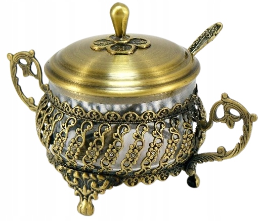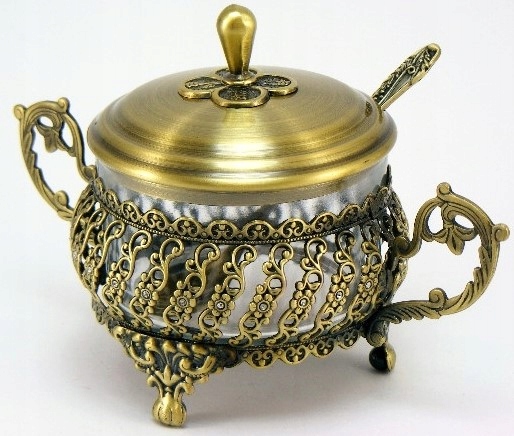Красивая и уникальная сахарница, латунь. Сахарница с декоративными мотивами и цирконами. Сахарница в комплекте с крышкой, ложкой и стеклянной вставкой. Сахарница отлично подойдет в качестве подарка на любой торжественный случай.