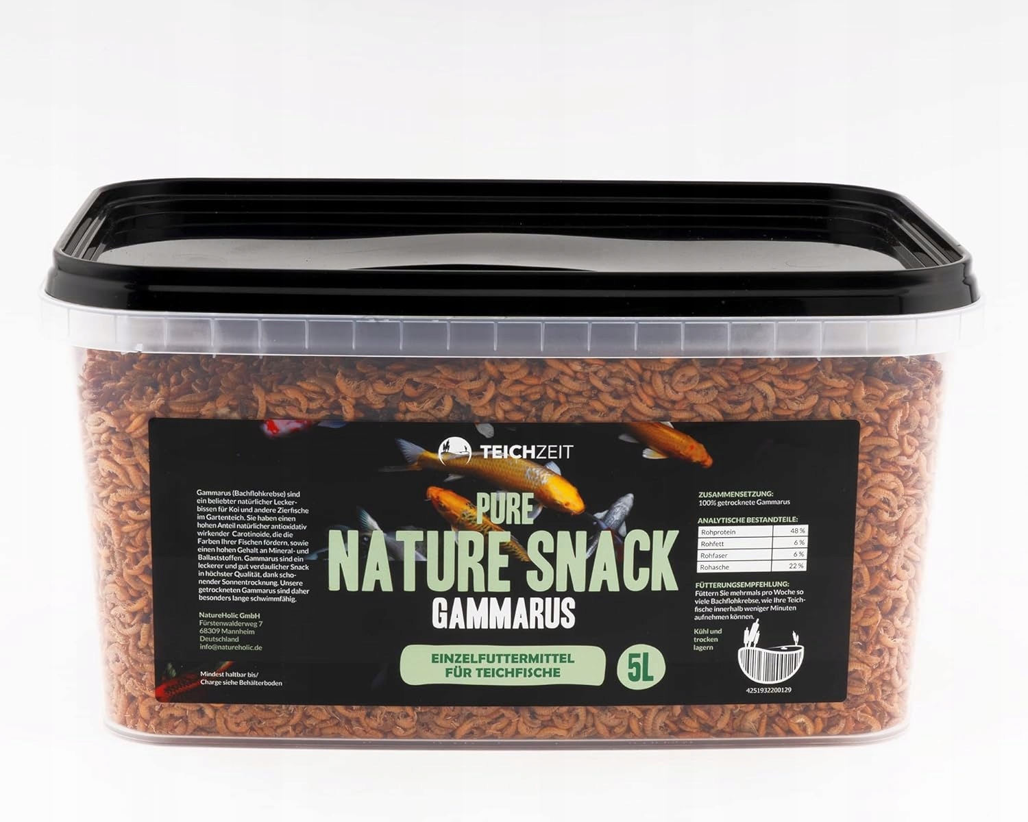 Teichzeit Pure Nature Snacks Gammarus (ручной амфипод) — идеальная закуска для кои и всех других прудовых рыб. Благодаря бережному процессу сушки наши ростки особенно богаты питательными веществами и могут долгое время плавать на воде. Это означает, что речные амфиподы в течение длительного времени будут доступны и менее агрессивным рыбам.