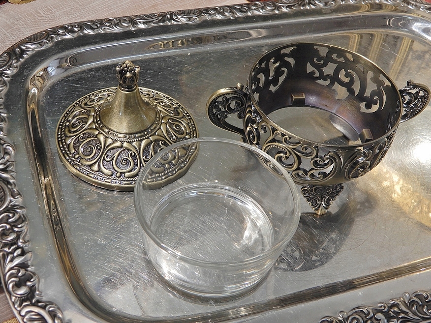 Откройте для себя элегантность и функциональность в нашем латунном кондитерском конфорте со стеклянной вставкой и тонко оформленными сторонами, которые источают сложные схемы открытой работы. Это не только сахарная чаша, но и универсальный контейнер, который идеально подходит для консервов, меда или икры.