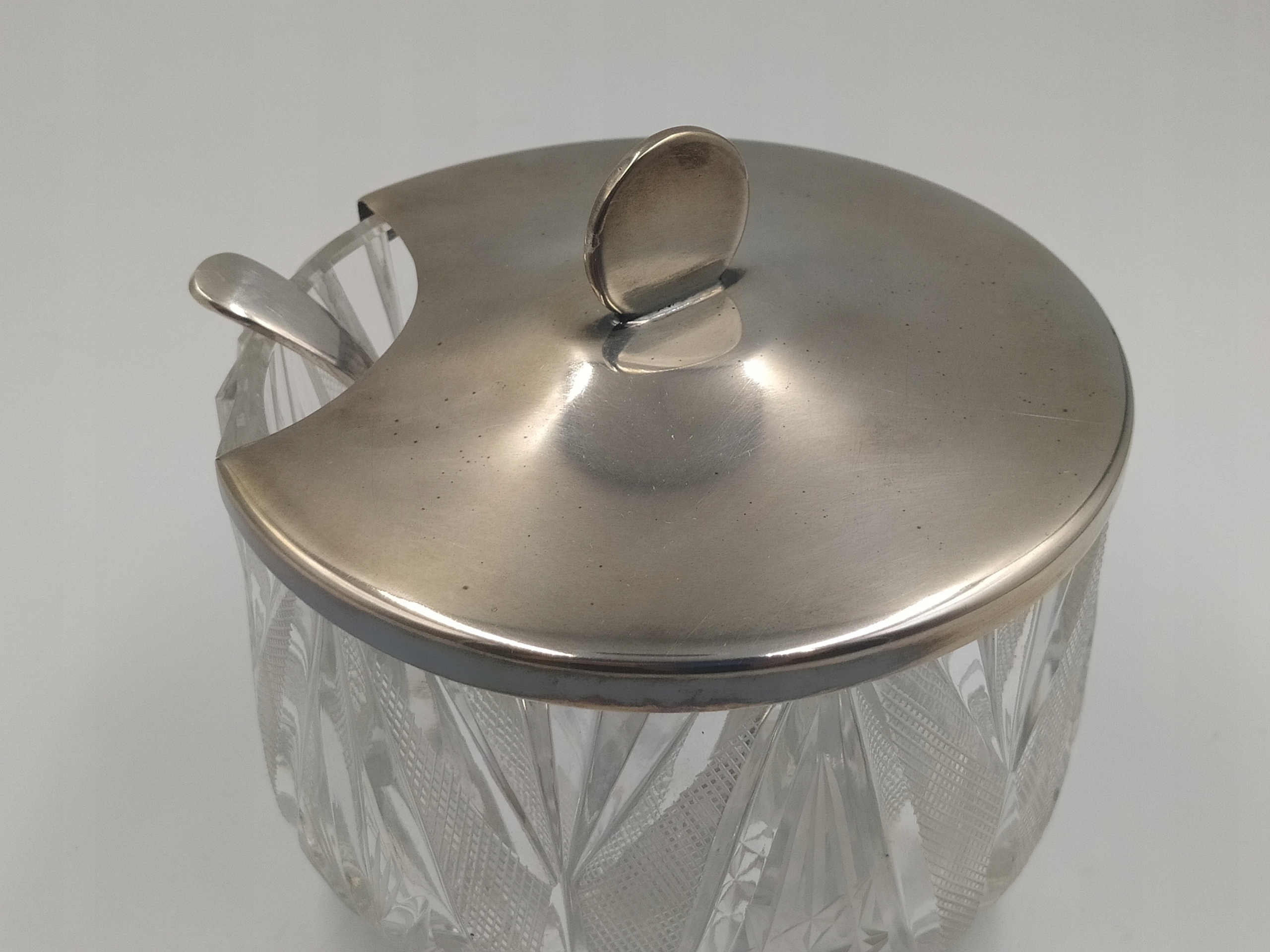 Предмет аукциона – хрустальная сахарница с серебряной крышкой пр. 800, исх. FH (Хефра), посеребренная ложка, высота ок. 13 см, диаметр 13 см, состояние видно на фотографиях.