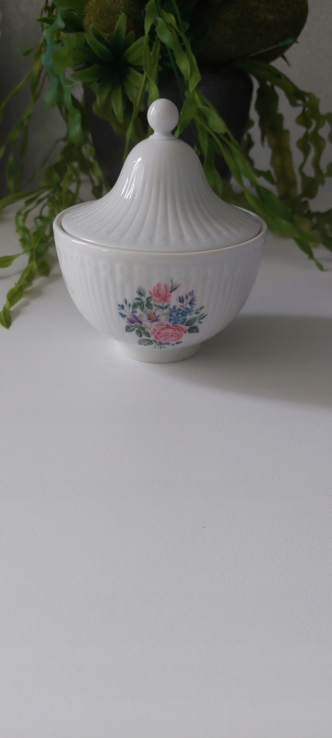 Сахарница в очень хорошем состоянии, размеры: высота без крышки 6,5см, диаметр 10см, высота с крышкой 11см.