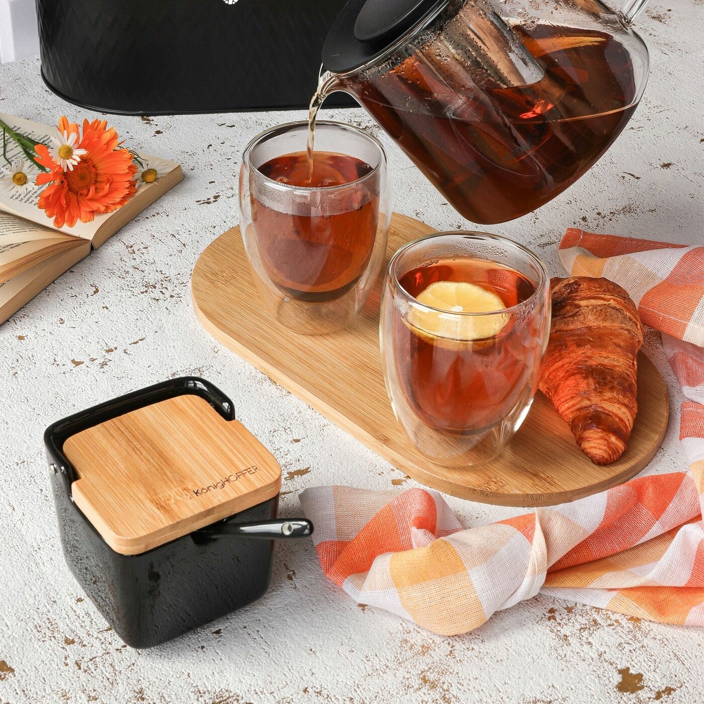 Керамическая сахарница Konighoffer с ложкой и бамбуковой крышкой, 270 мл, изготовлена из черного фарфора NBC. Вы также можете использовать изделие в качестве кухонного контейнера, например, для соли или какао. Размеры сахарницы 9,3 х 9,3 х 9 см, форма правильная. Это облегчает хранение модели. С его помощью вы элегантно дополните свою десертную посуду. Вы также расширите свой домашний набор фарфоровой кухонной тары. Ложка в комплекте также изготовлена из фарфора. Можно мыть вместе с сахарницей, но без деревянной крышки, в посудомоечной машине.