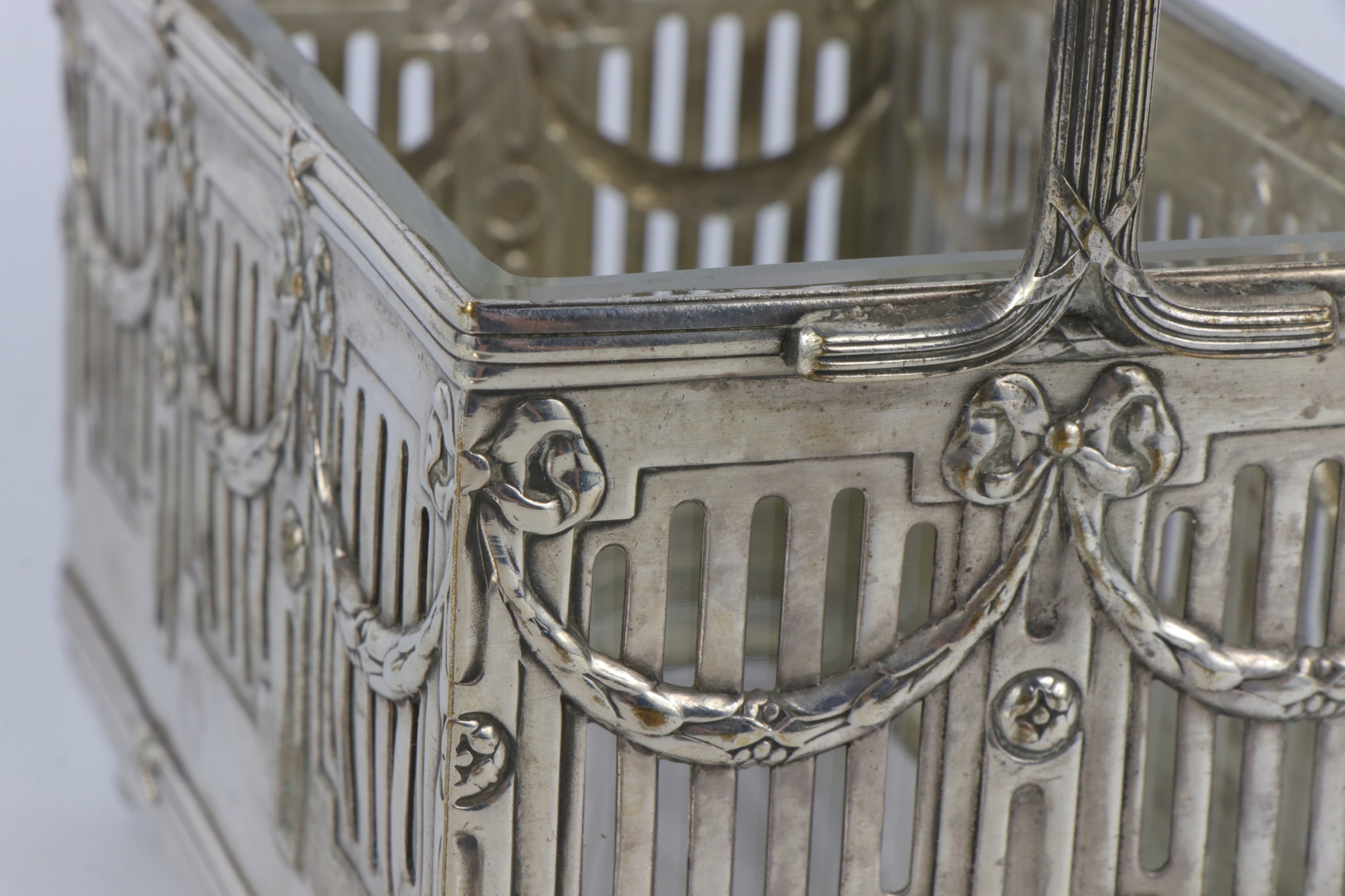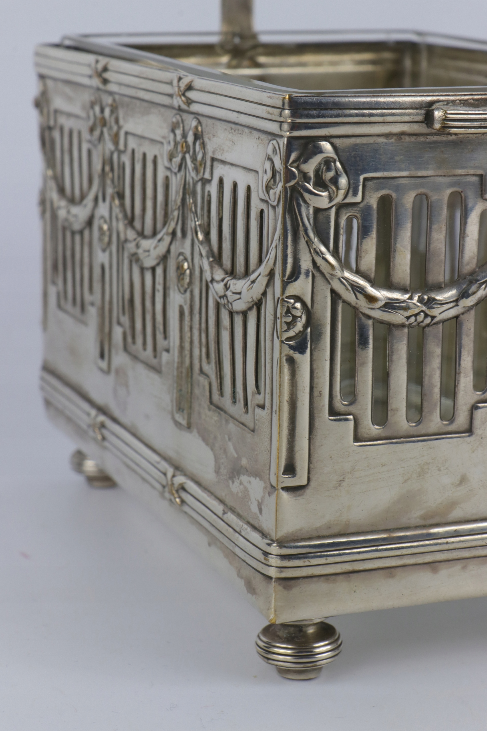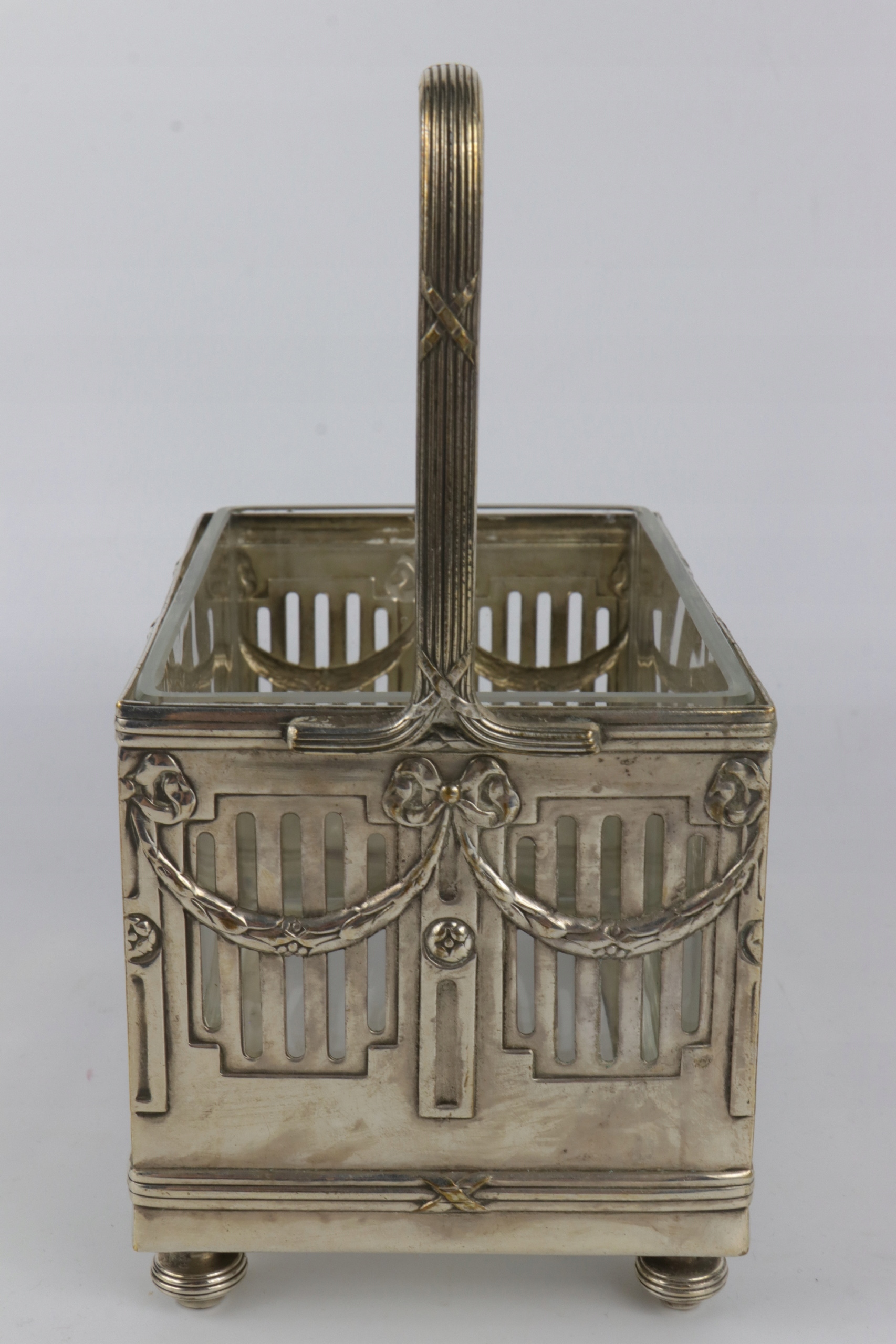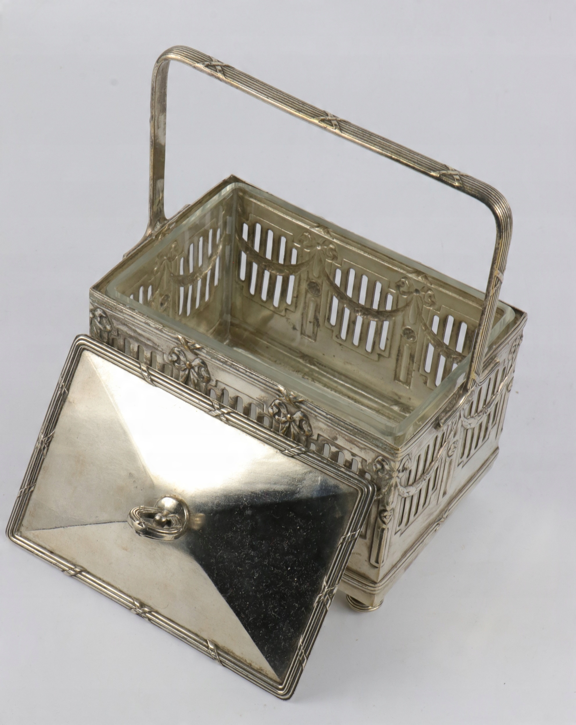 Как видно на фотографиях, сахарница в хорошем состоянии, серебро сохранилось хорошо, в целом очень хорошее состояние. Самая утилитарная вещь. Стеклянная вставка, без сколов и трещин, очень хорошее состояние.