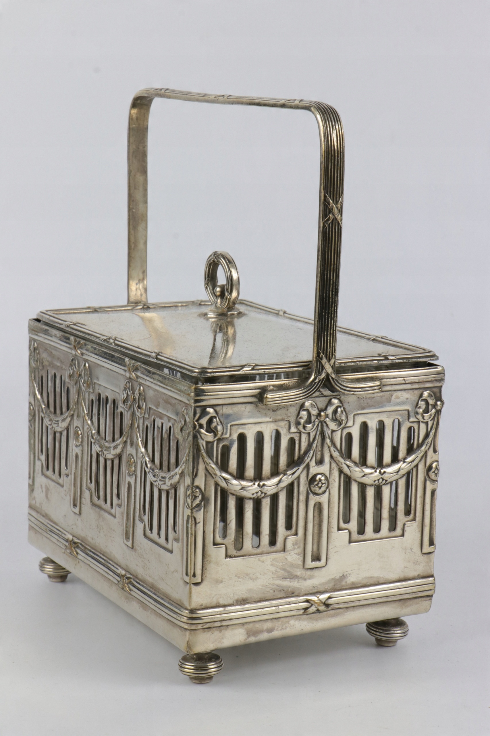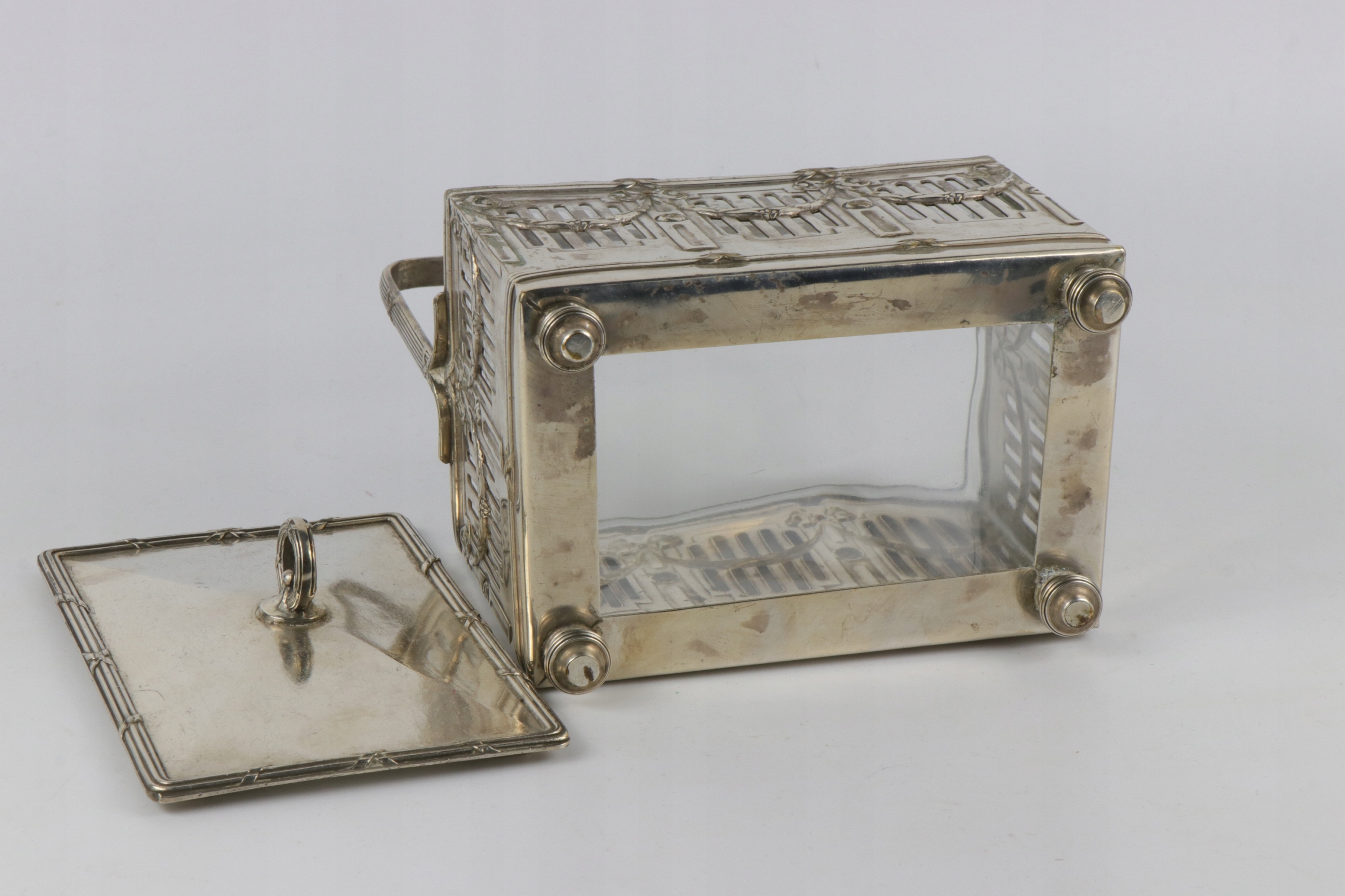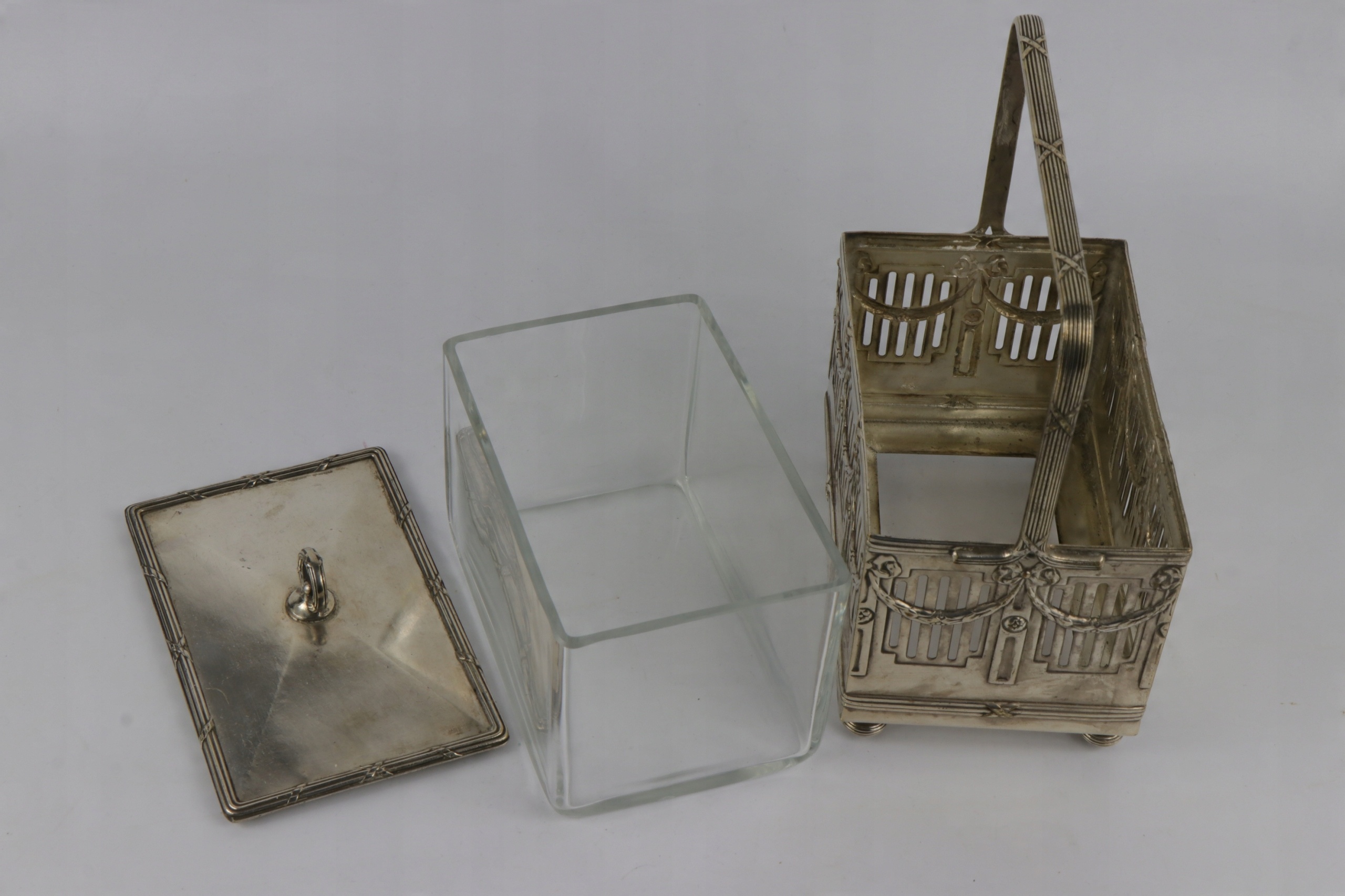 Сахарница прямоугольной формы в стиле модерн с хрустальной вставкой. Верхняя кромка вставки полированная. Сахарница в декоре в стиле ампир. Хрустальная вставка с крышкой. Предмет не подписан, но несомненно второй половины XIX века. Возможно, викторианская Англия.
