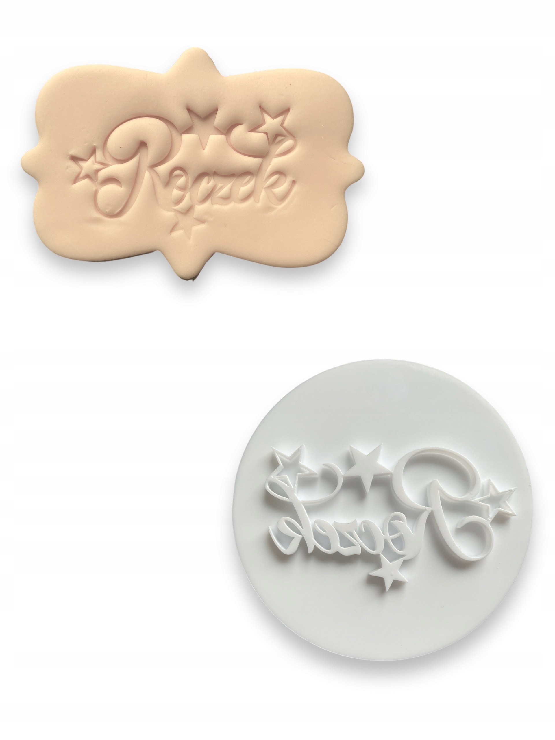 Рекомендуем раскатать сахара массы до толщины примерно 3-4 мм. Штамп следует расположить на сахарной массе, лучше всего прижать его рукой.