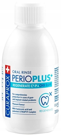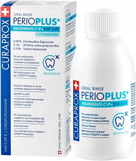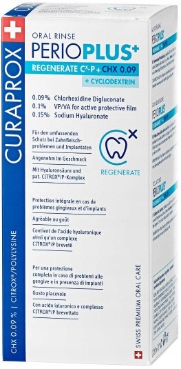 Хлоргексидина биглюконат 0,09%. Он также содержит гиалуроновую кислоту. Жидкость Perio plus Regenerate поддерживает регенерацию тканей после стоматологических операций и борется с недугами, связанными с сухостью во рту.