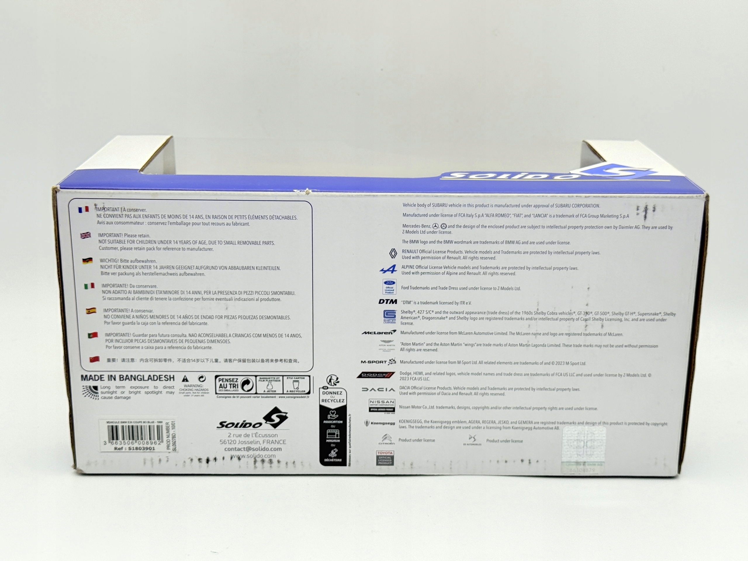 Модель имеет каталожный номер S1803901 и произведена в Бангладеш. Это коллекционная модель BMW M3, созданная Solido с вниманием к деталям. EAN продукта: 3663506009013.
