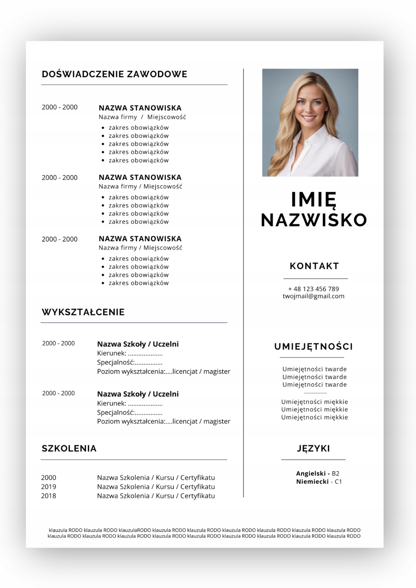 Если вам нужно резюме 2-стороннее + сопроводительное письмо - его найдете в другом объявлении (цена 25,00 злотых).
