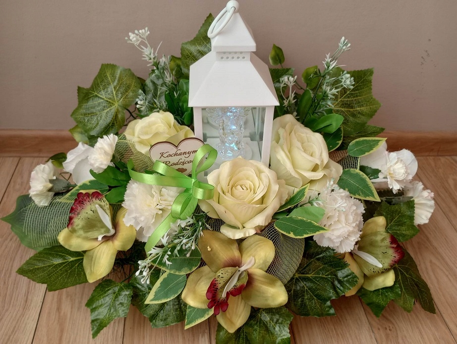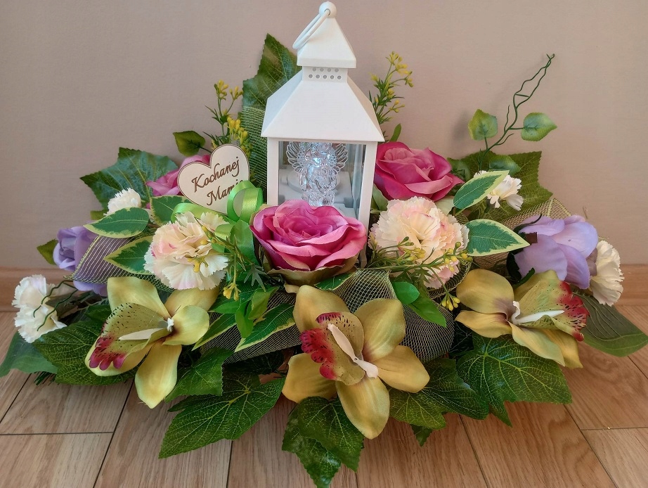 ИСКУССТВЕННАЯ КОМПОЗИЦИЯ С ФОНАРЕМ СО СВЕТЯЩИМСЯ АНГЕЛОМ + БУКЕТ ДЛЯ ВАЗЫ