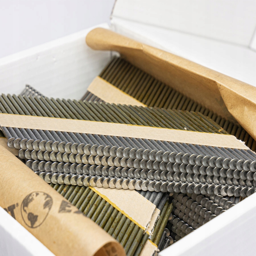 Гвозди для пневматических, газовых и электрических гвоздезабивателей. Гвозди соединены с бумагой под углом 34°.