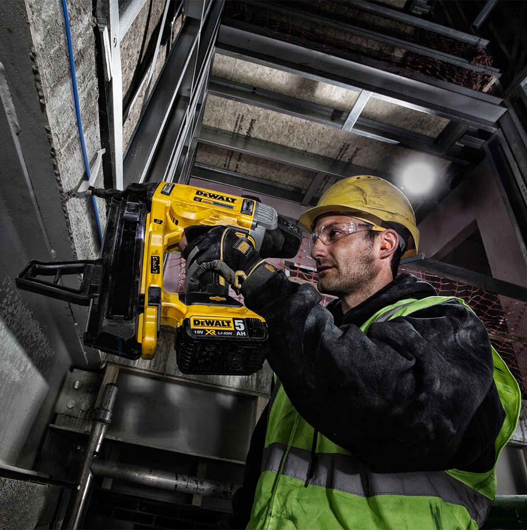 - Гиперзабиватель по бетону с литий-ионным аккумулятором XR емкостью 5,0 Ач, 18 В и бесщеточным двигателем, обеспечивающим увеличенное время работы и мощность для забивания более длинных гвоздей.